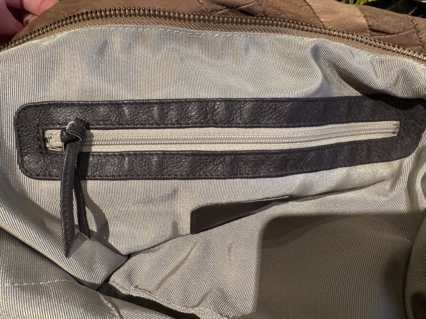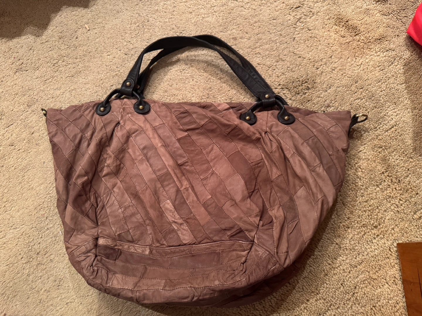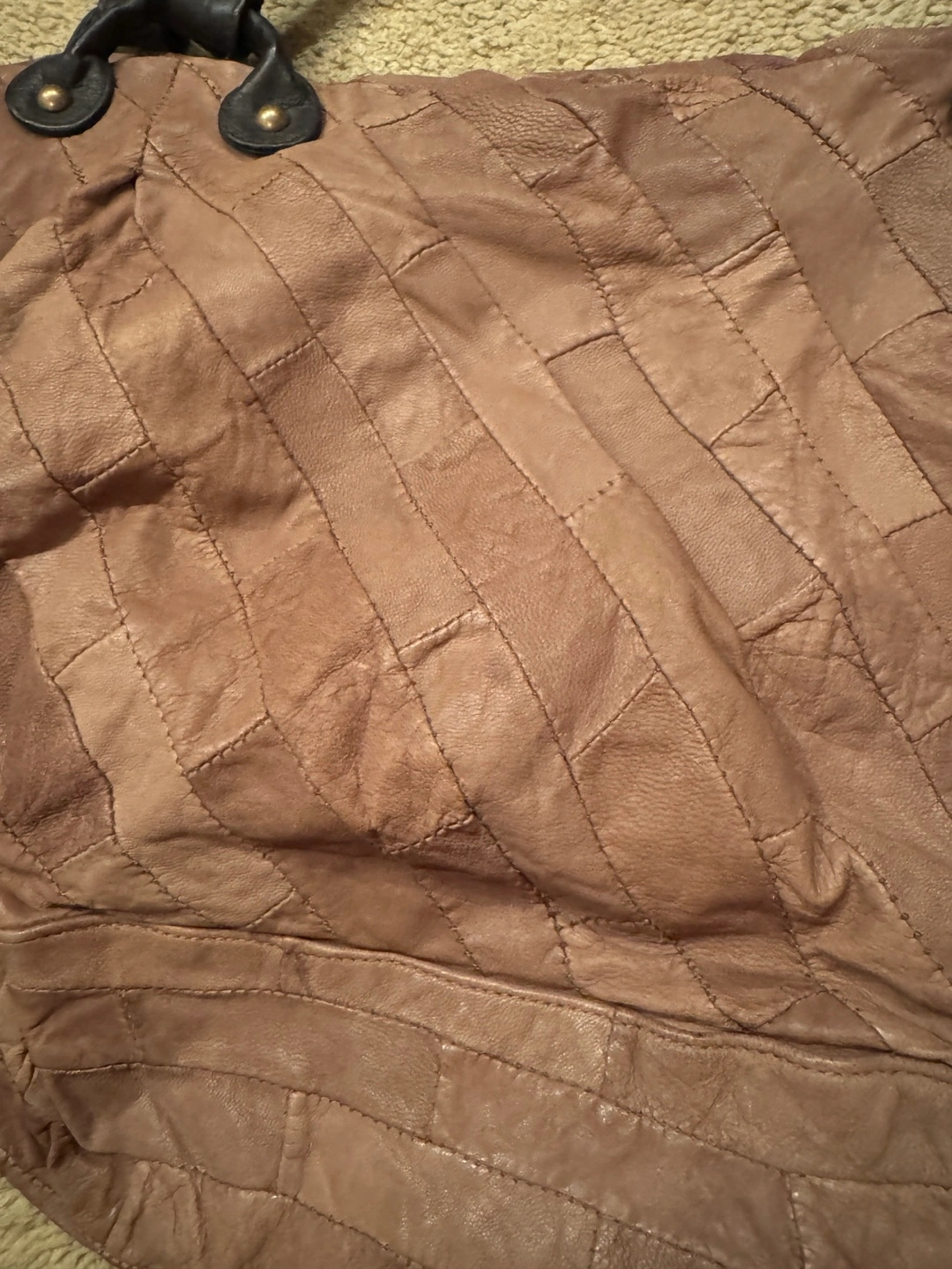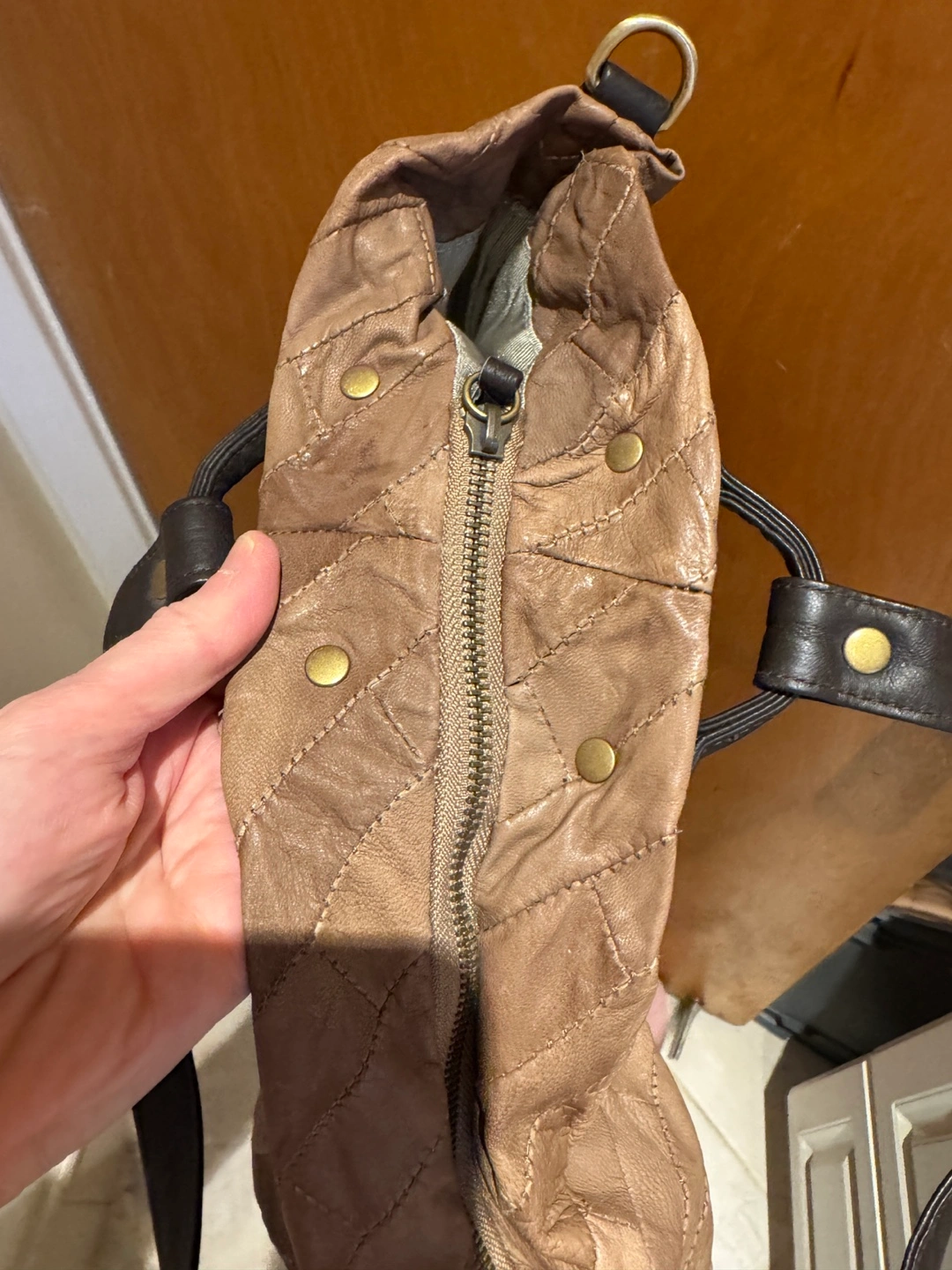 Large brown leather tote bag with a quilted design. It features two top handles and a zipper closure. The bag has a single inside pocket.