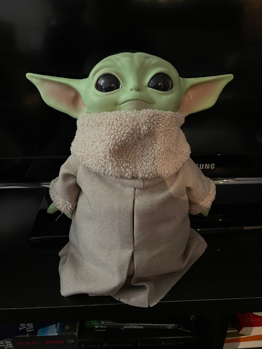 Baby Yoda toy. 11 inches tall. Head is firm but body is plush and soft.