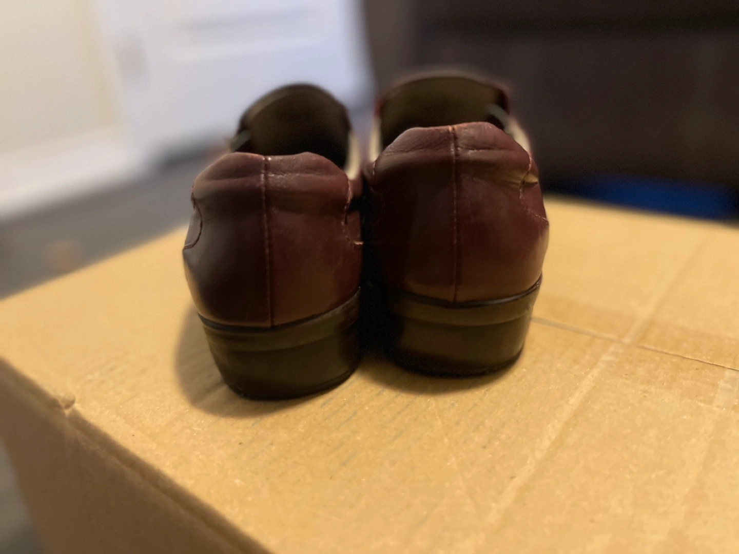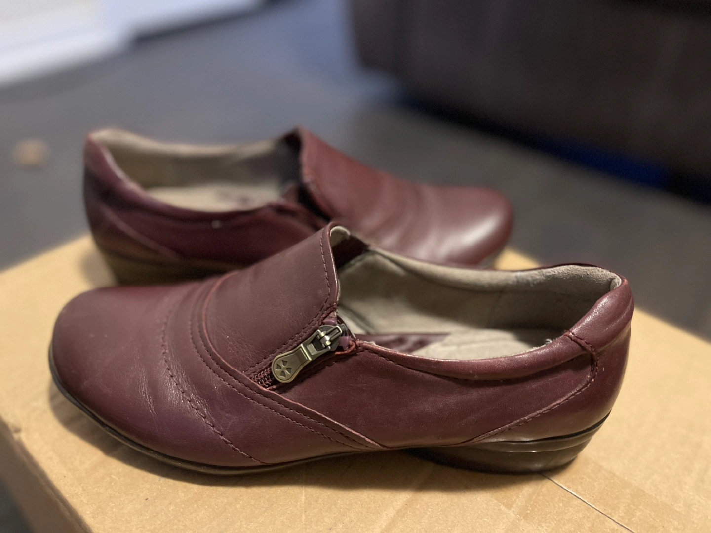 Burgundy leather slip-on shoes with a zipper detail. They have a slightly raised heel. These shoes are great for everyday wear and are comfortable and stylish.