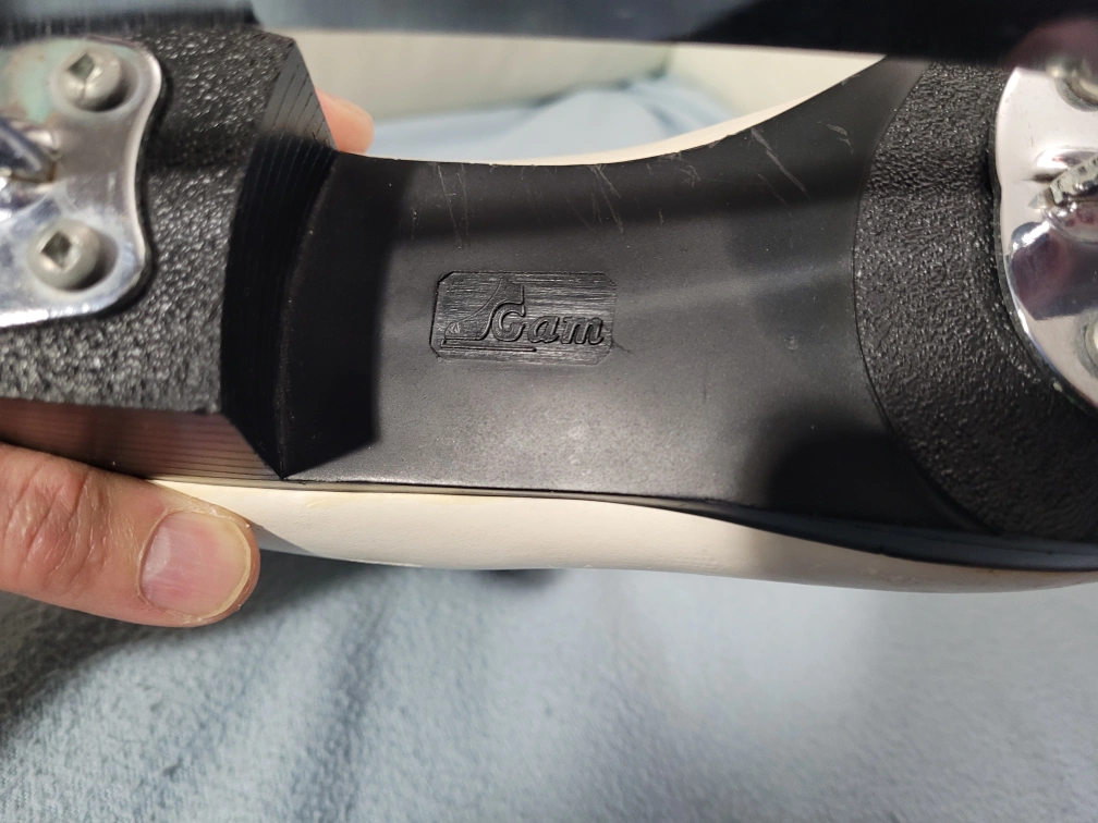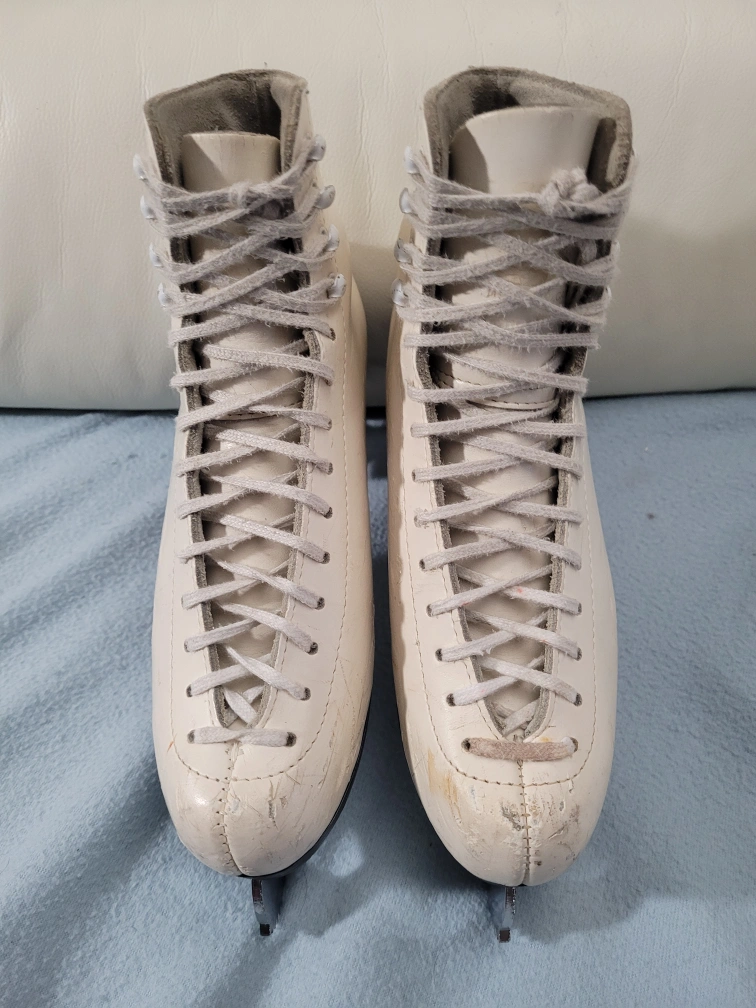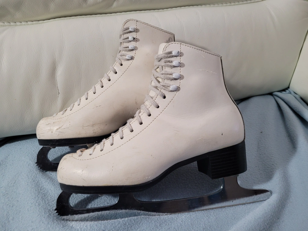 PLEASE READ. Location is ETOBICOKE. Kipling and Eglinton area. Excellent condition Gam figure skates SIZE 6 skate. MK Blade made in Sheffield England. Padded tongue. Why rent skates? Buy them and save $ Yes you may try them on first. White leather figure skates with black soles and silver blades. They are in used condition and show some wear. Size 6