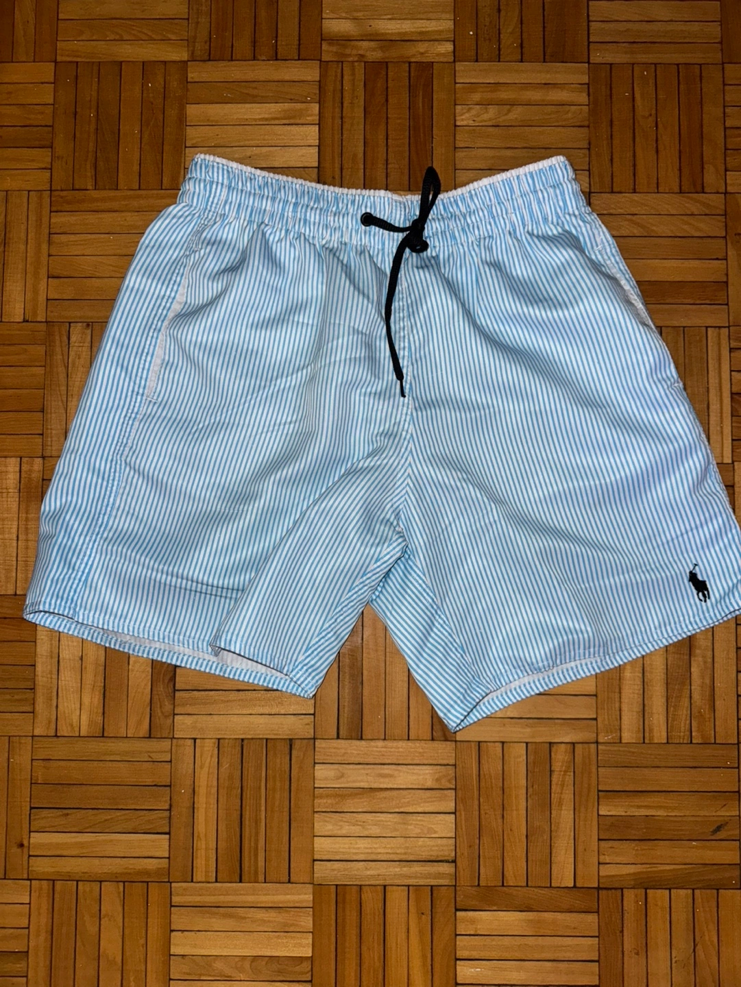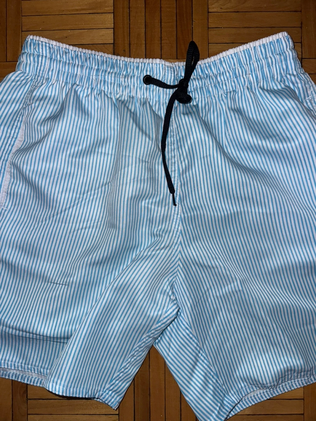 Blue and white striped swim trunks with a black drawstring. Pockets on the sides.