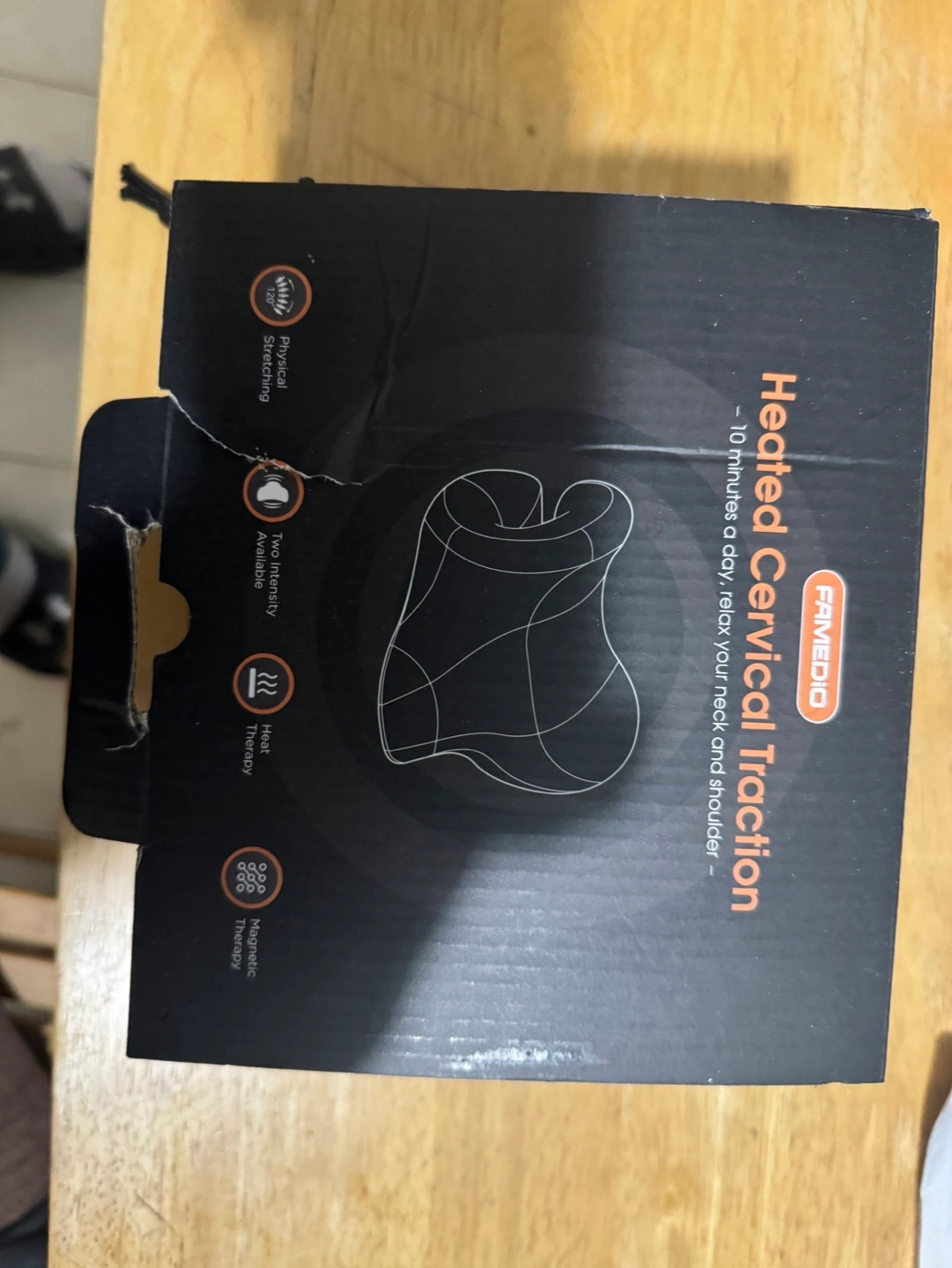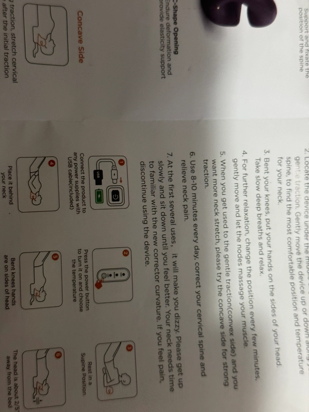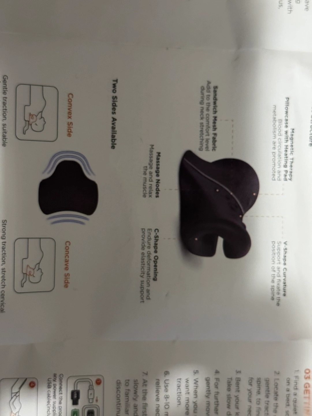 Heated cervical traction device. Includes user manual and charging cable.