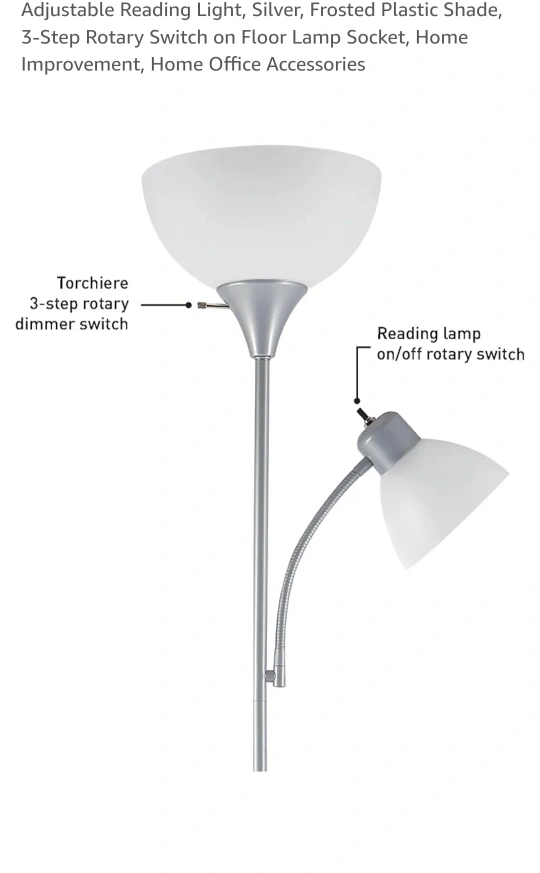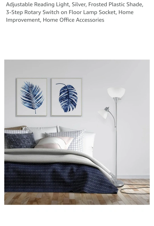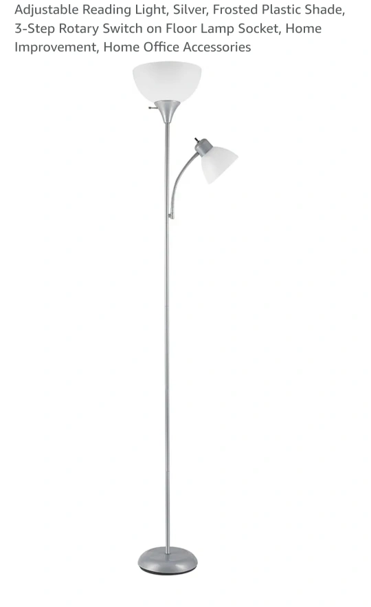 Chic Silver floor lamp with frosted plastic shades. The lamp has a 3-step rotary switch and a reading light with an on/off rotary switch. The reading light is adjustable.Ideal for bedroom or living space.