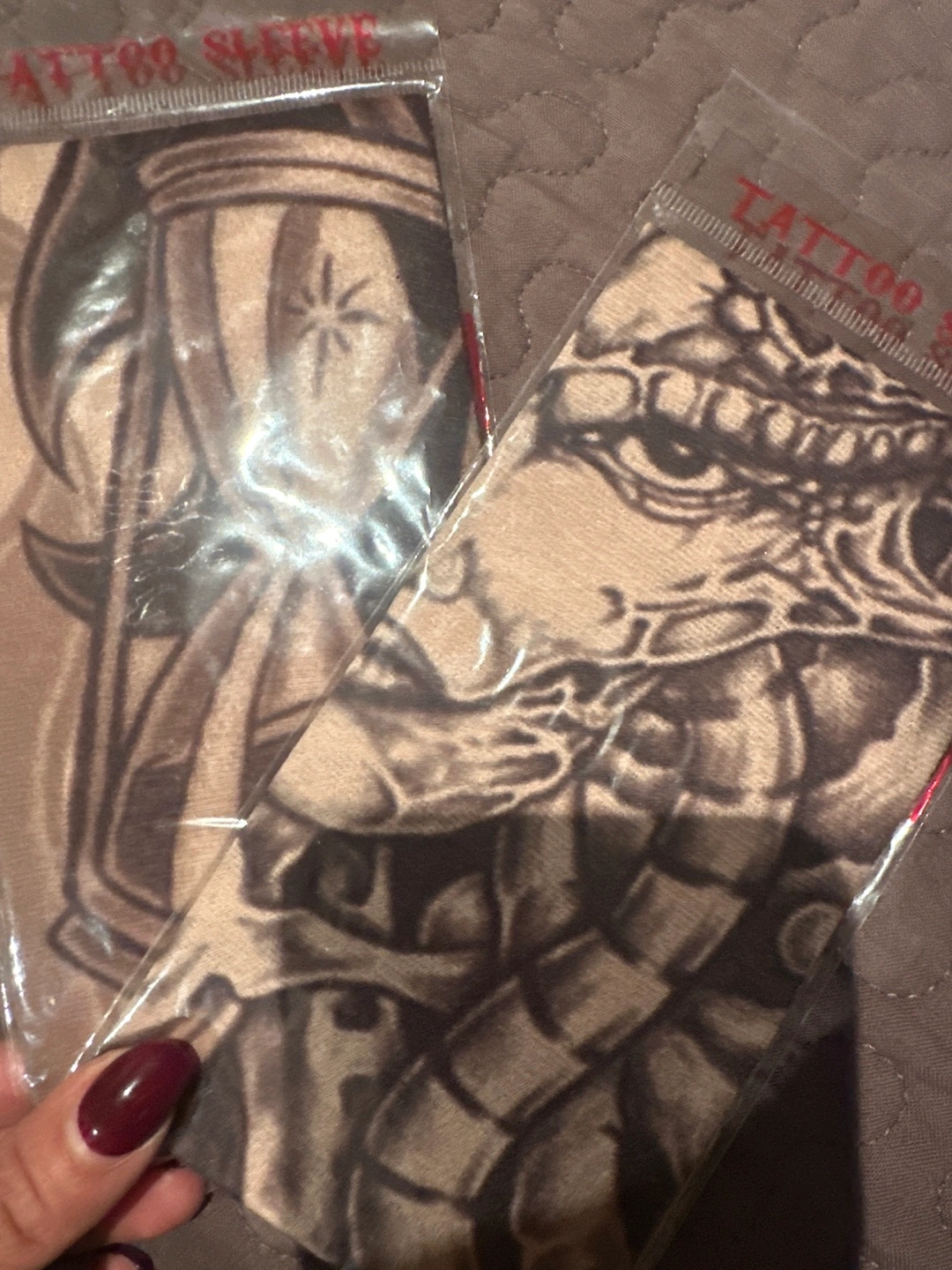 Two fake tattoo sleeves. One has a skull design and the other has a geometric design.