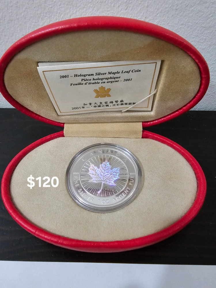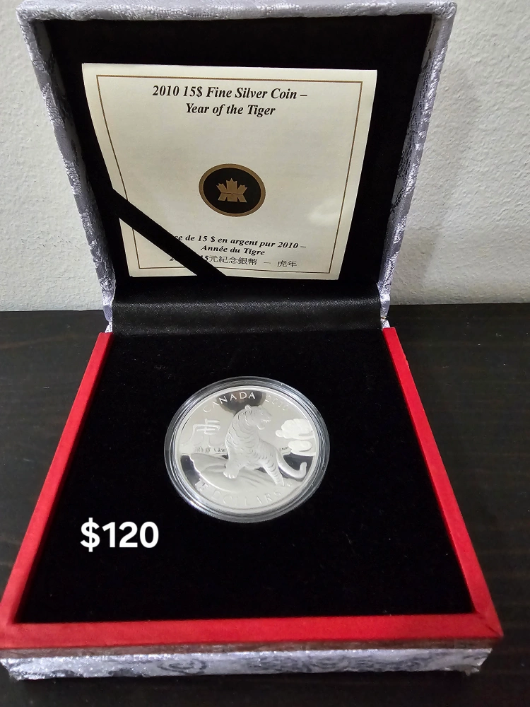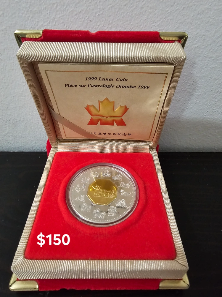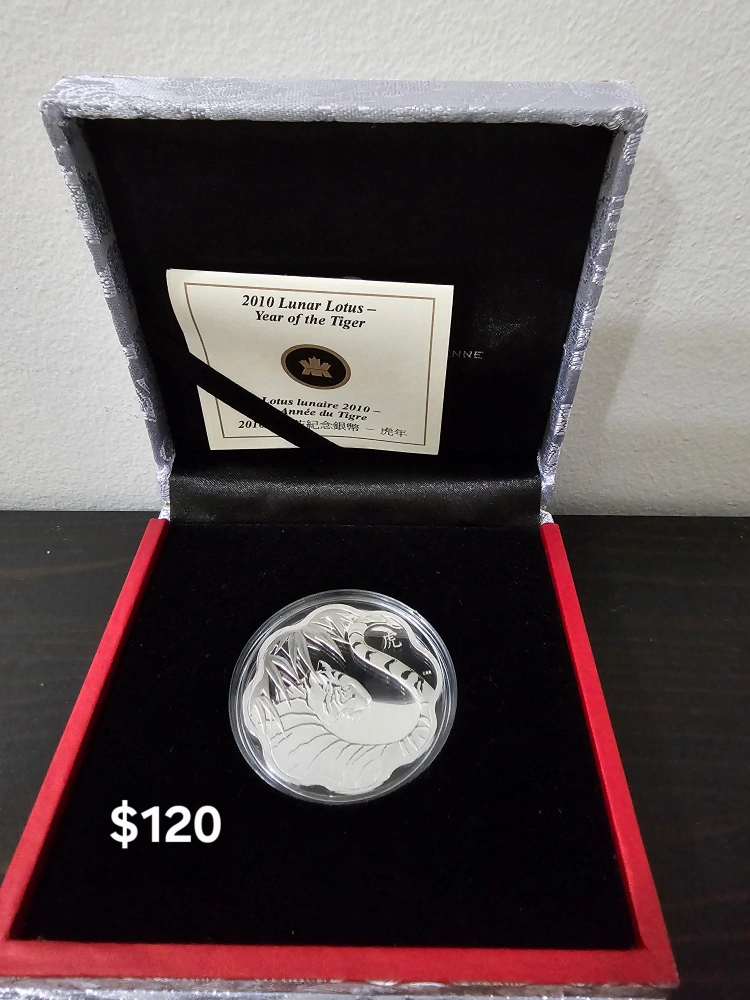 Four Canadian lunar coins. Includes the 1999 Year of the Rabbit, 2001 Silver Maple Leaf Coin, 2010 Year of the Tiger, and 2010 Year of the Tiger Lotus.