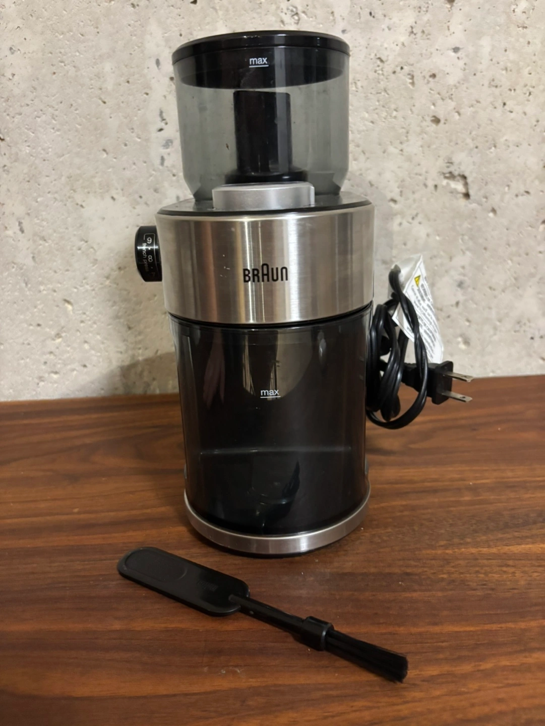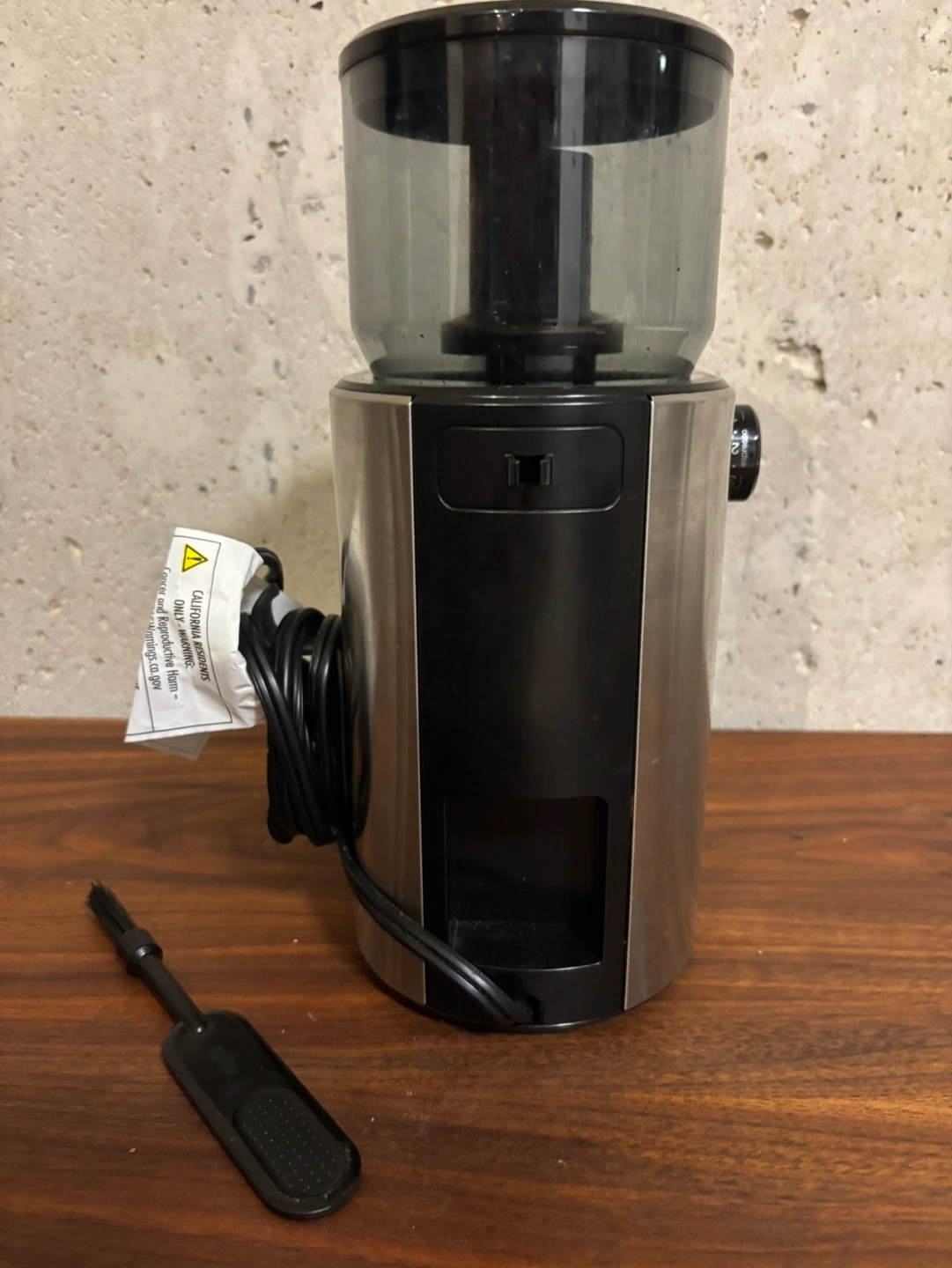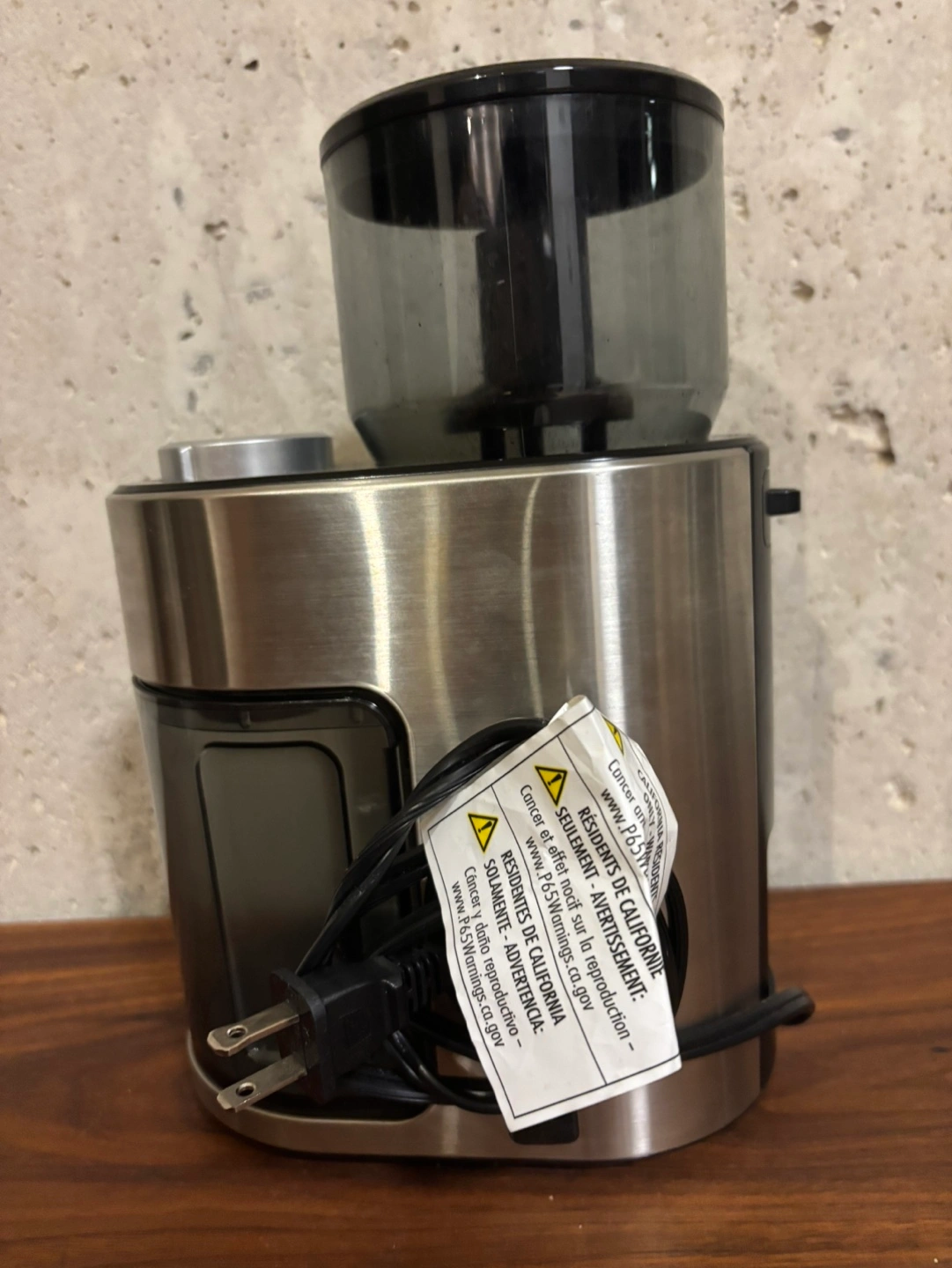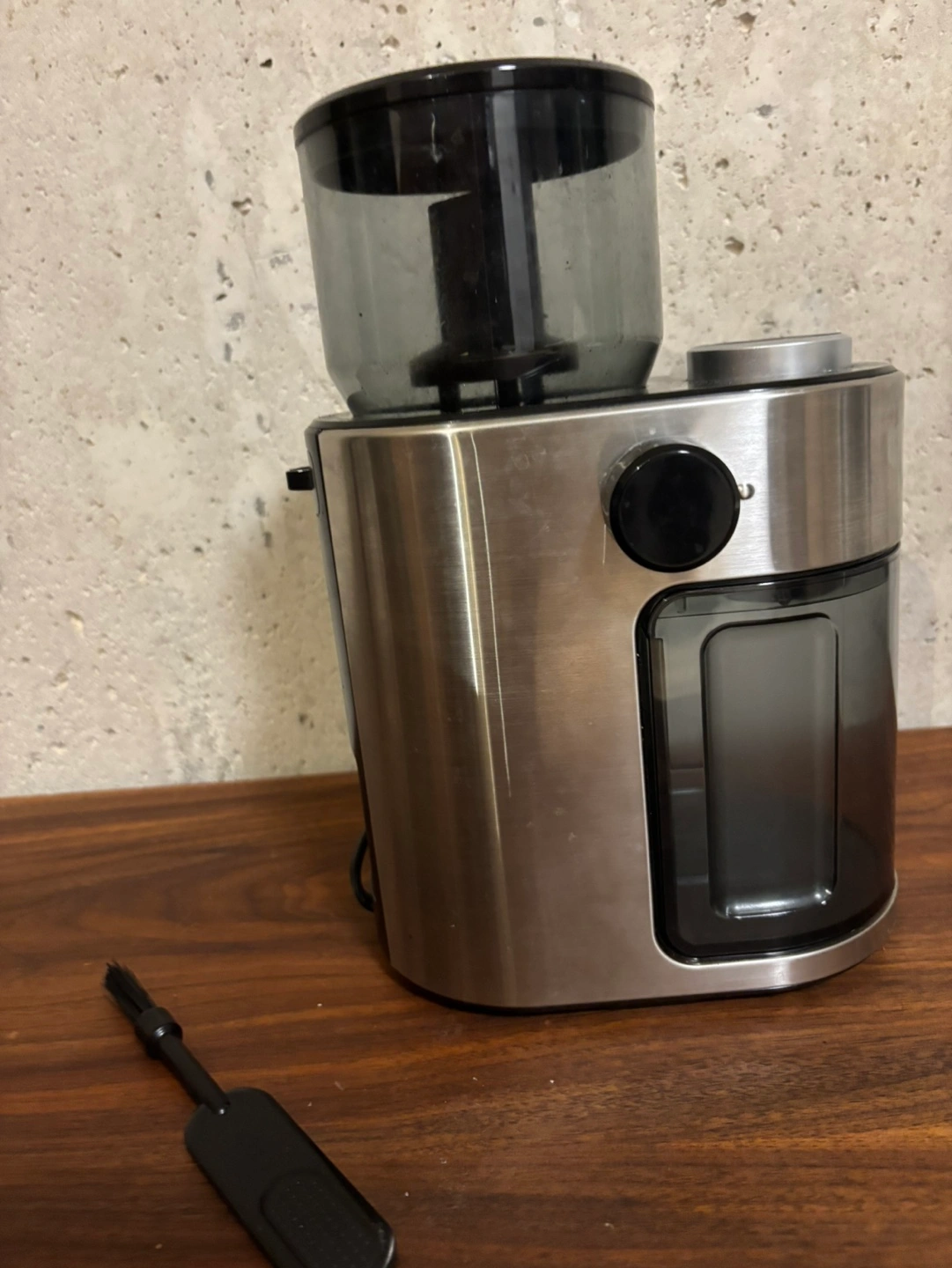 Stainless steel coffee grinder with a removable bean hopper and grind chamber. Includes a cleaning brush.