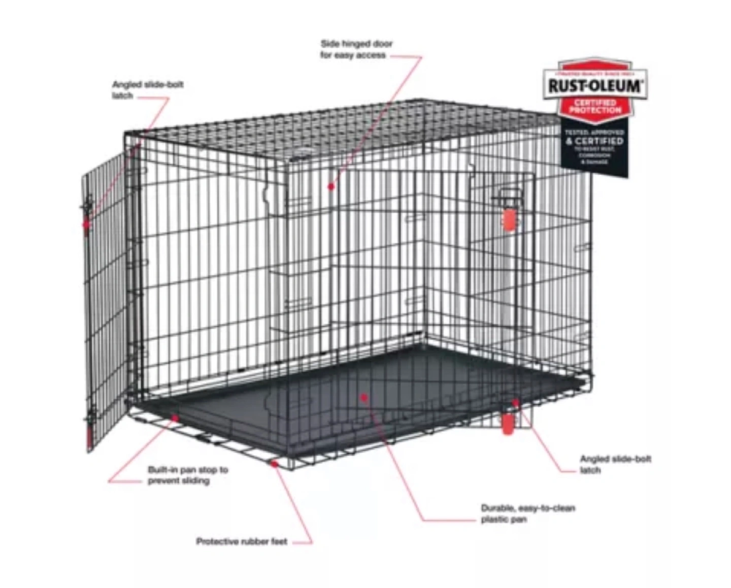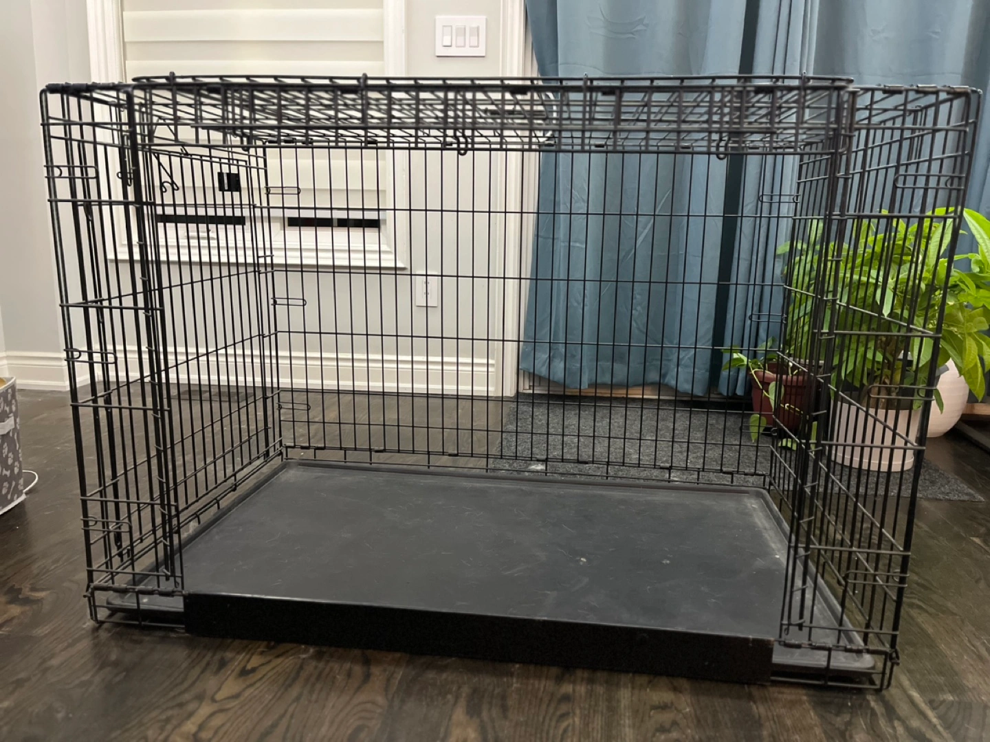 Large dog crate with black finish and a plastic pan. Includes a side door with a latch.