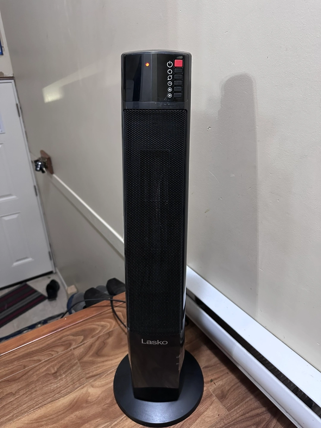 Tower ceramic heater, with digital display. Has multiple heat settings timer setting and an oscillation feature. No remote.