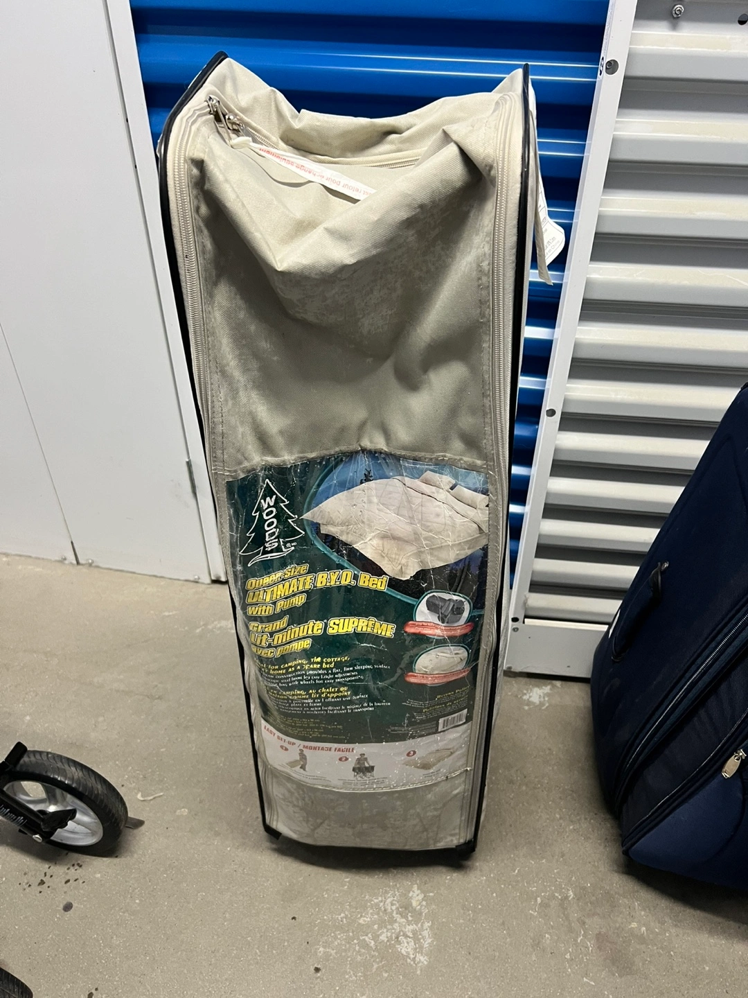 Queen size air mattress with built-in pump. Great for camping, the cottage, or as a spare bed.