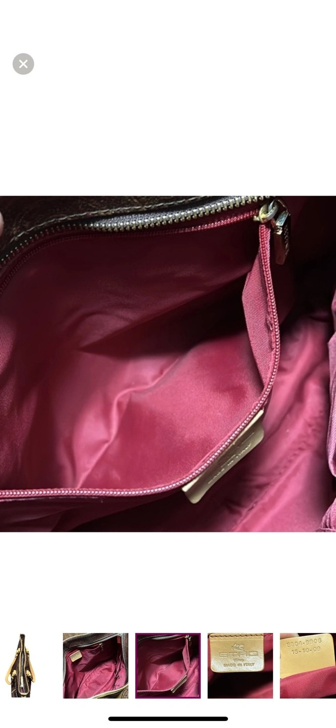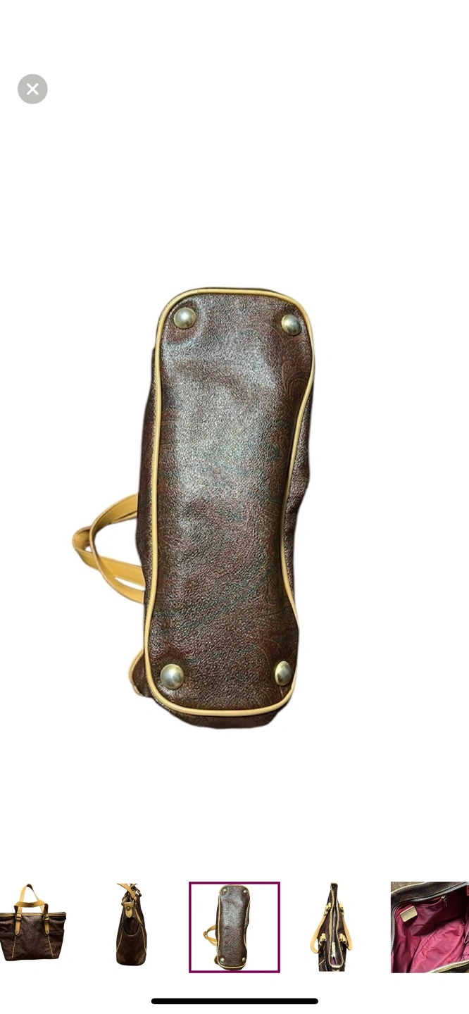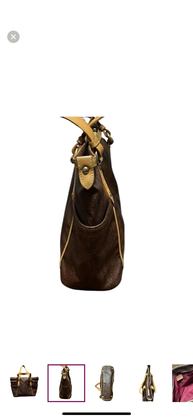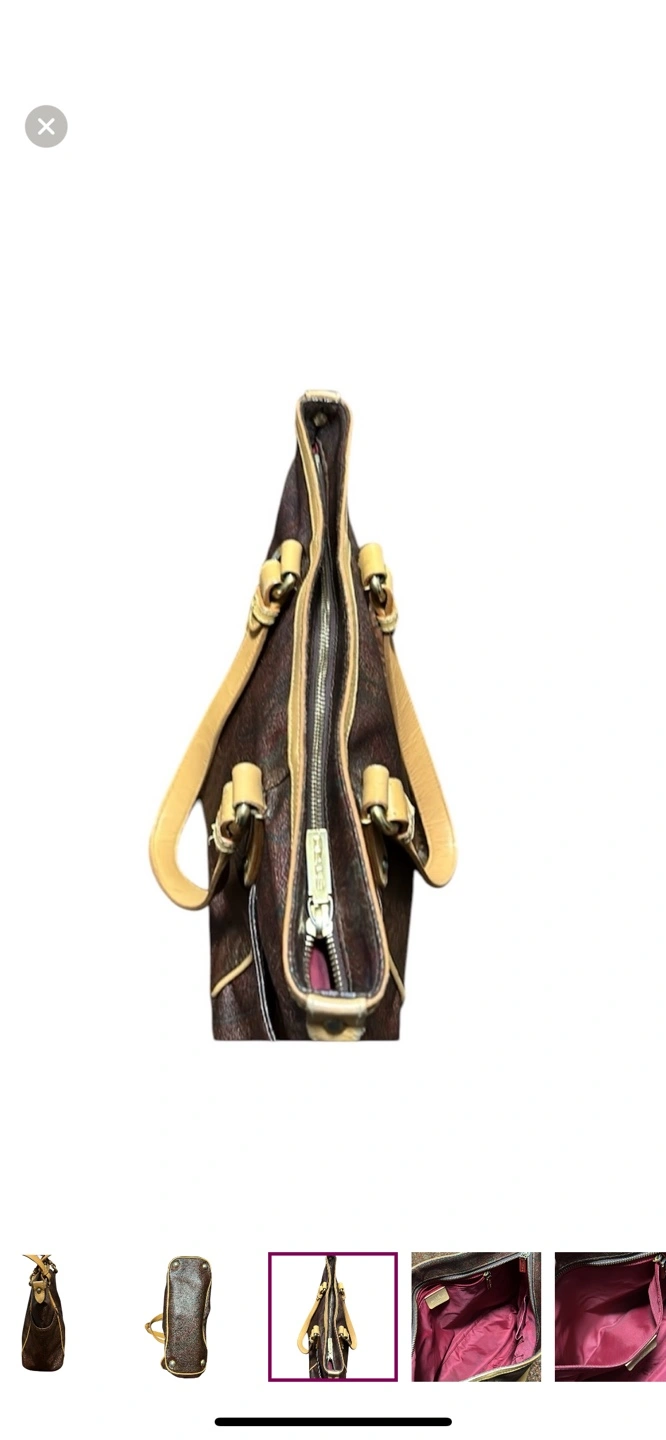 Authentic and vintage brown and tan paisley Etro tote bag with leather handles and accents. Has 2 exterior pockets on both sides and a zipper closure on the top. Made in Italy.