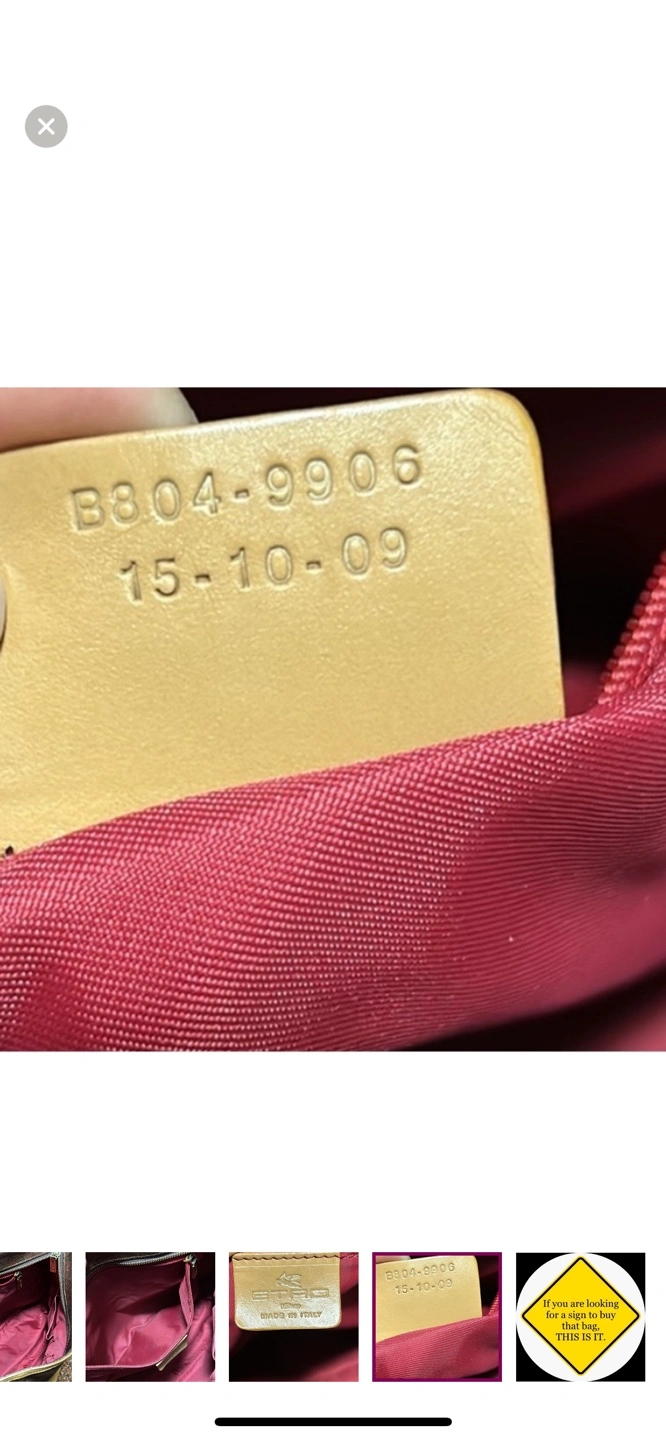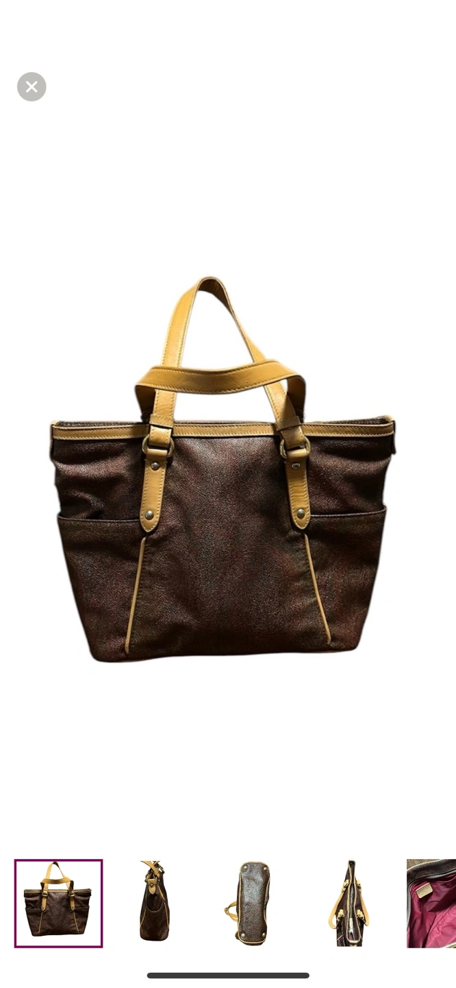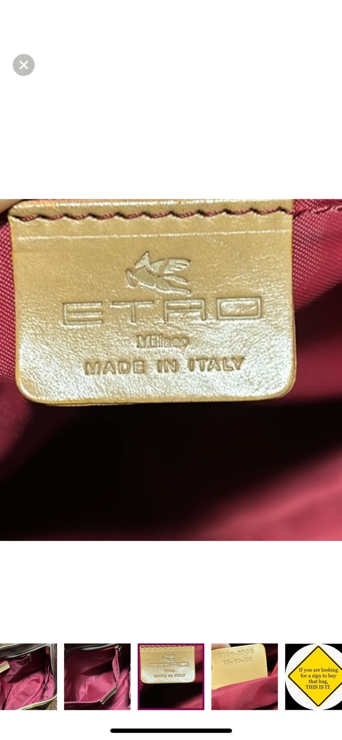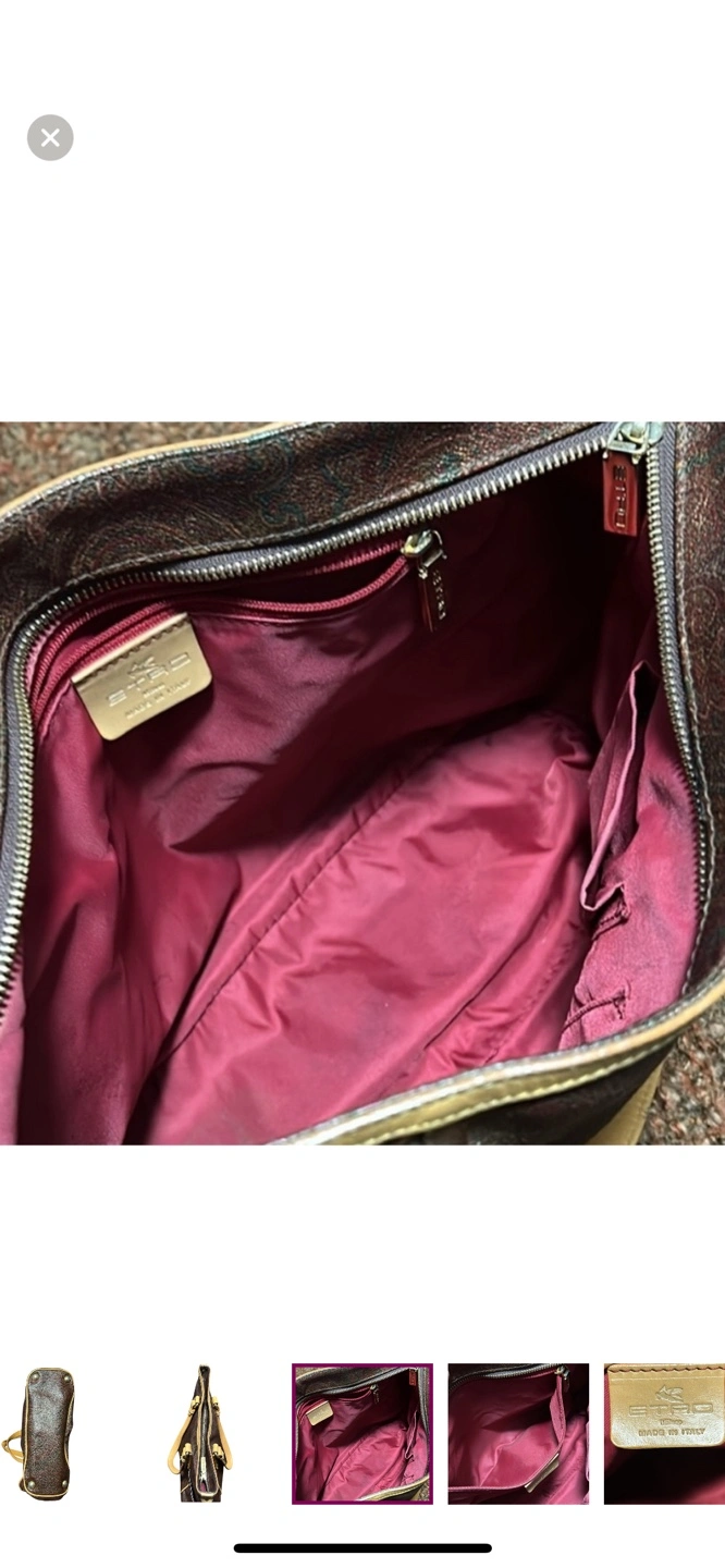 Authentic and vintage brown and tan paisley Etro tote bag with leather handles and accents. Has 2 exterior pockets on both sides and a zipper closure on the top. Made in Italy.