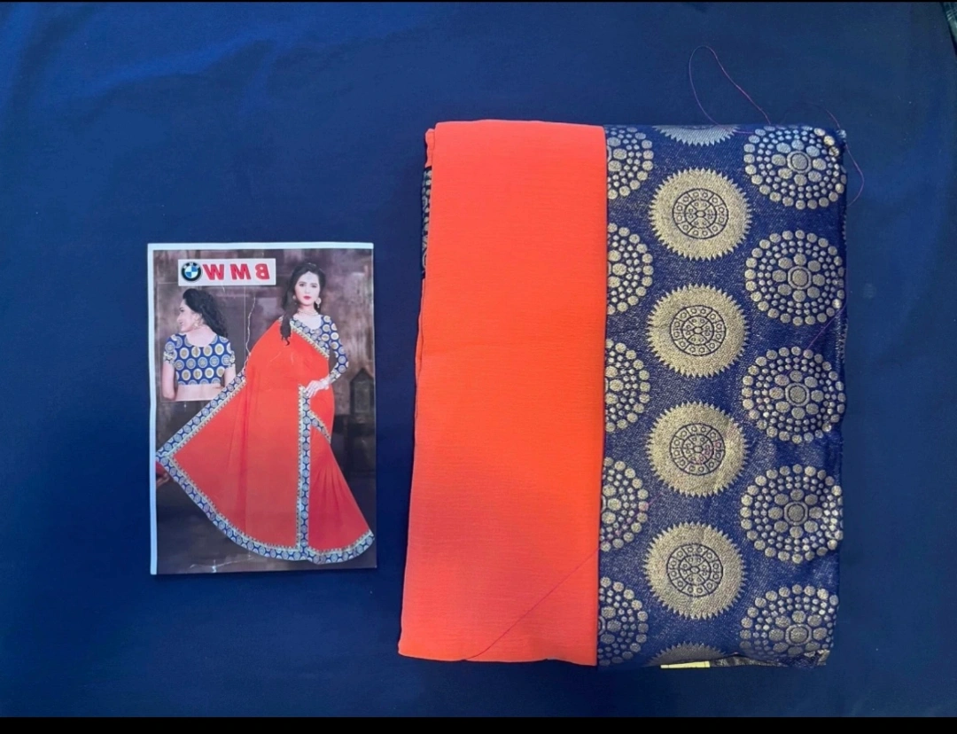 Orange chiffon saree with a royal blue brocade border. Comes with a matching blouse pieces.