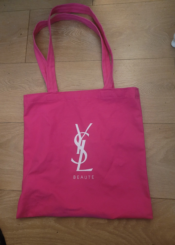 Pink canvas tote bag with white Yves Saint Laurent Beauté logo.