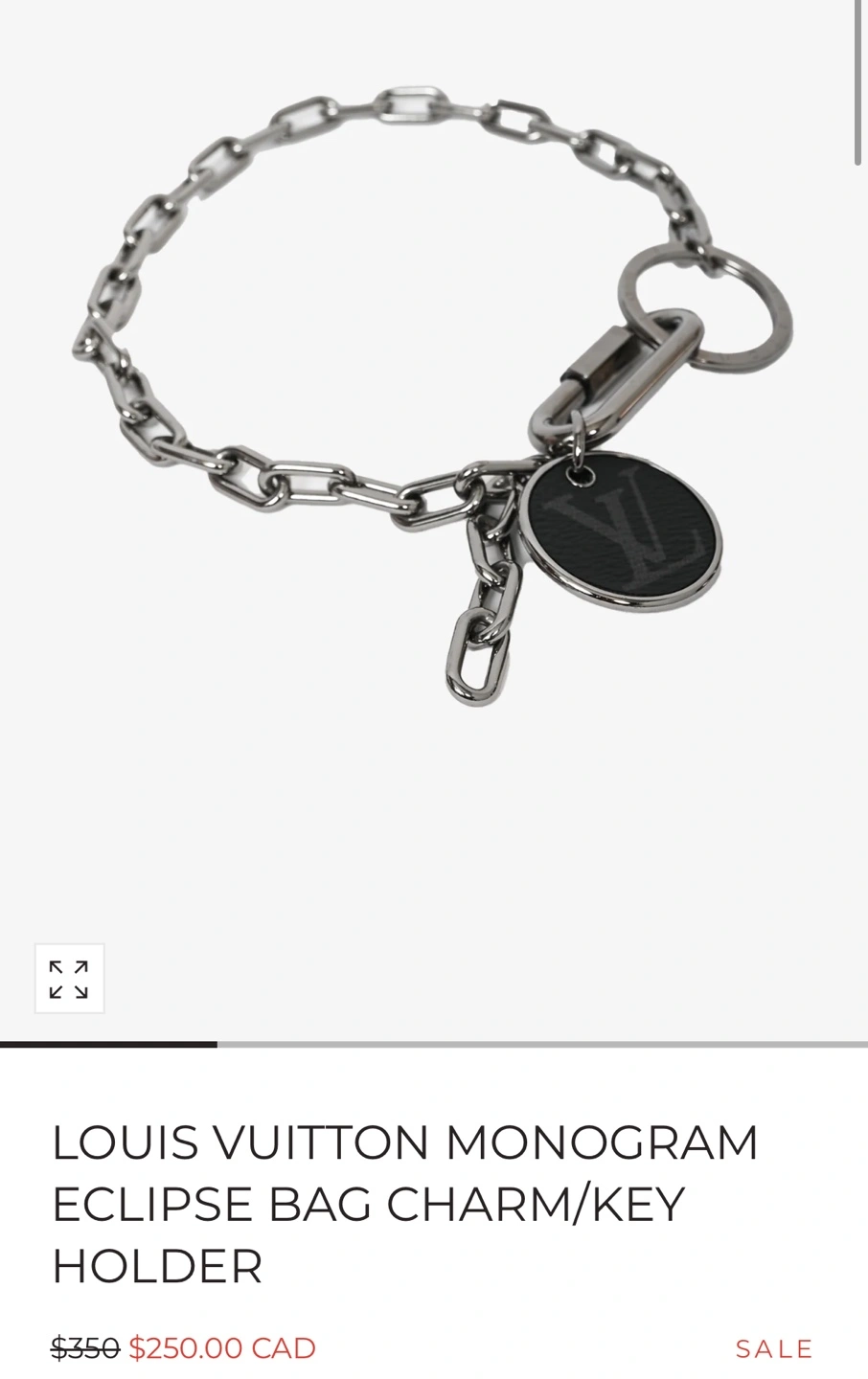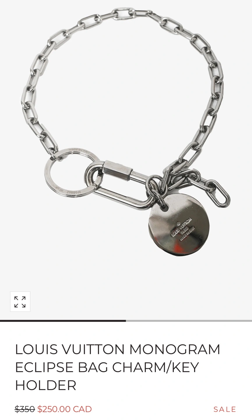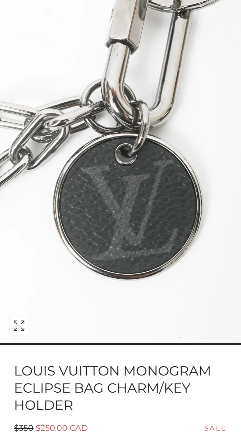 86Silver chain bag charm with a round black LV logo. Comes with a carabiner clip and a key ring.
