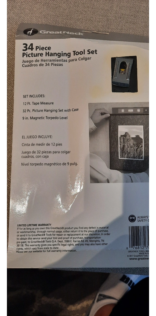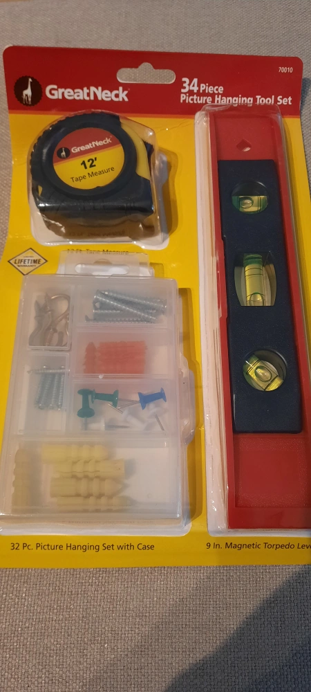 Selling an unused hanging kit. Includes tape measure, picture hanging set with case, and magnetic torpedo level.