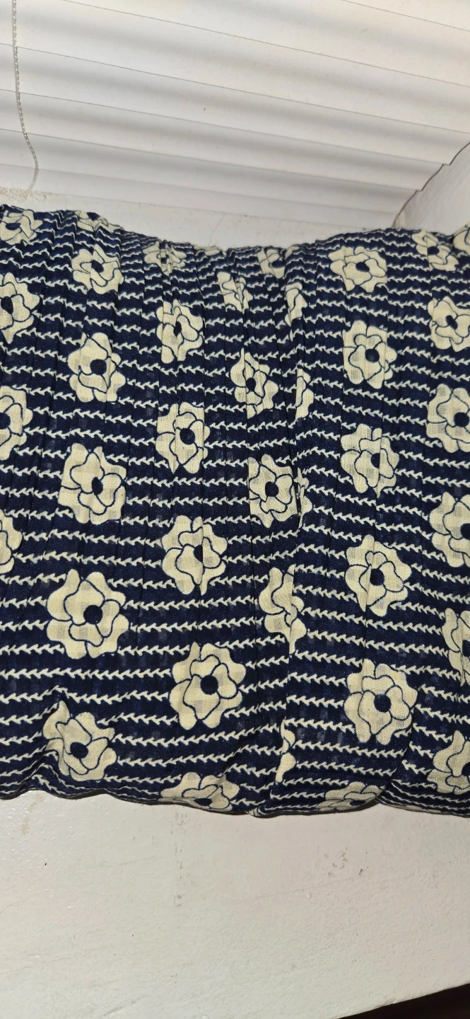 A charming women's skirt featuring a dark blue base with a white and yellow floral print. It has a black elasticated waistband with a subtle textured design.