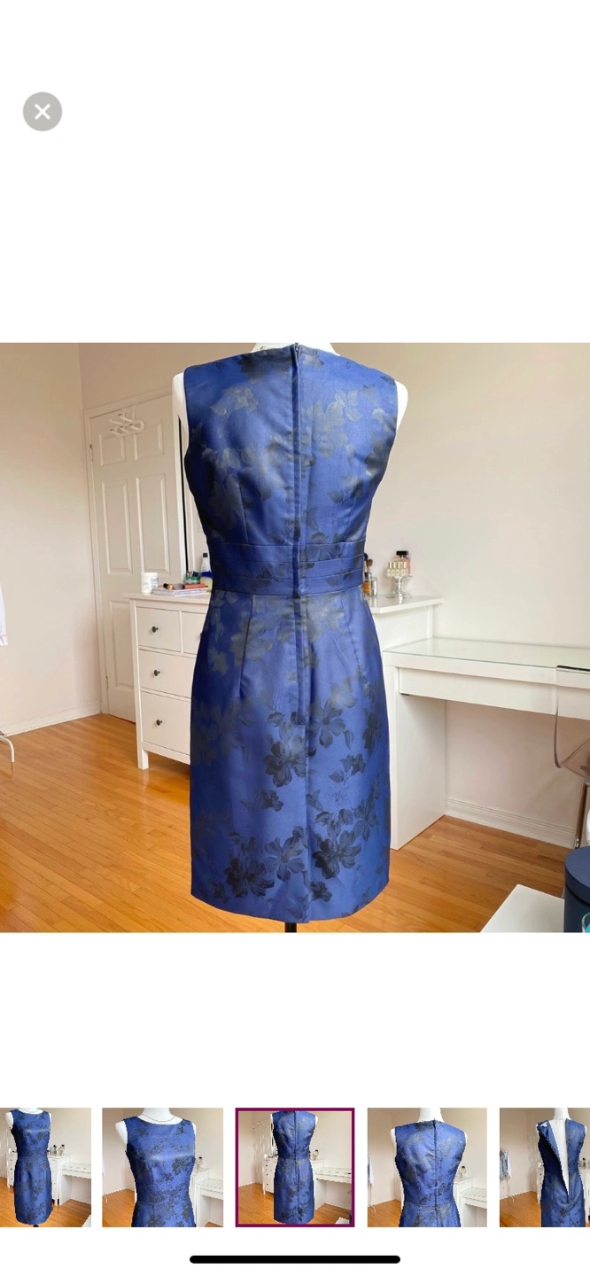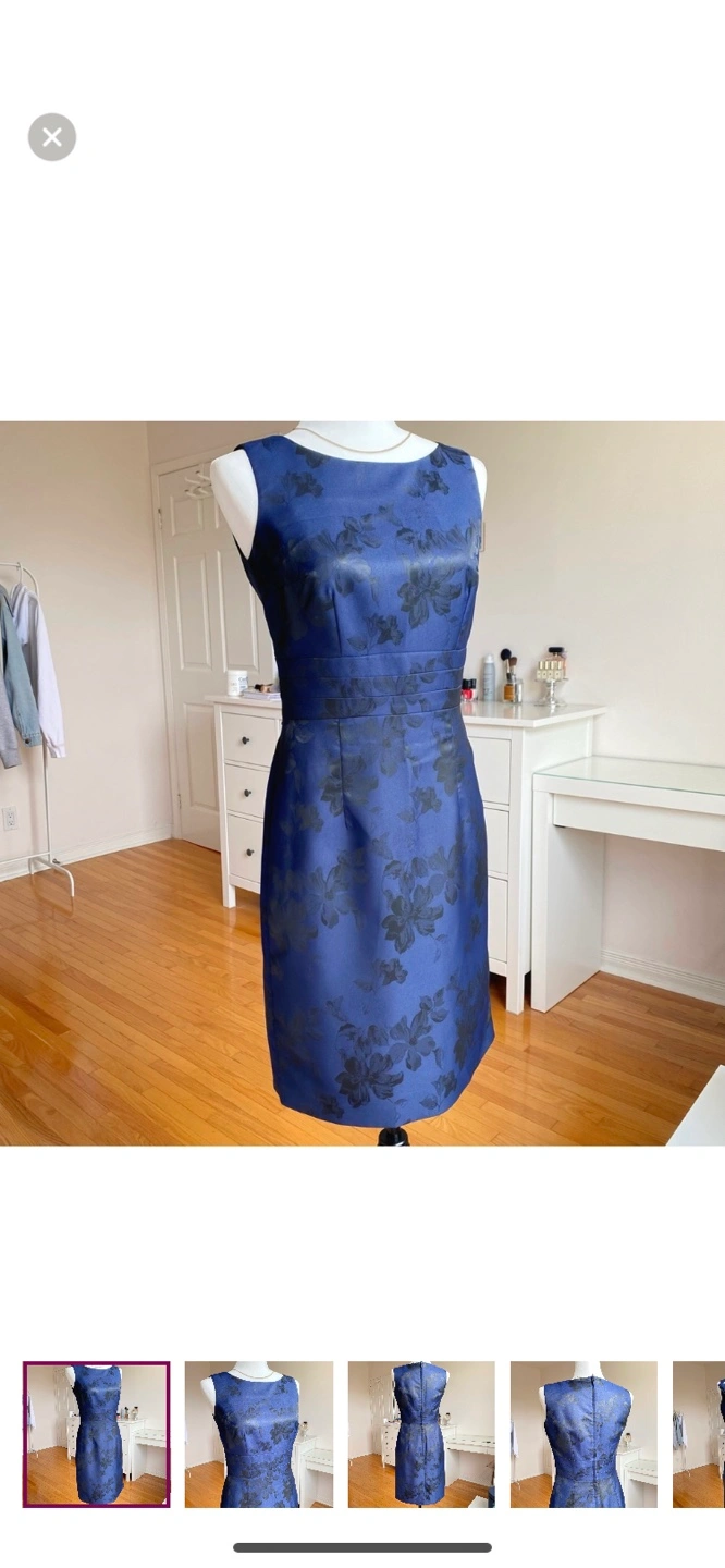 Sleeveless, blue dress with black floral pattern. Has a zipper in the back.