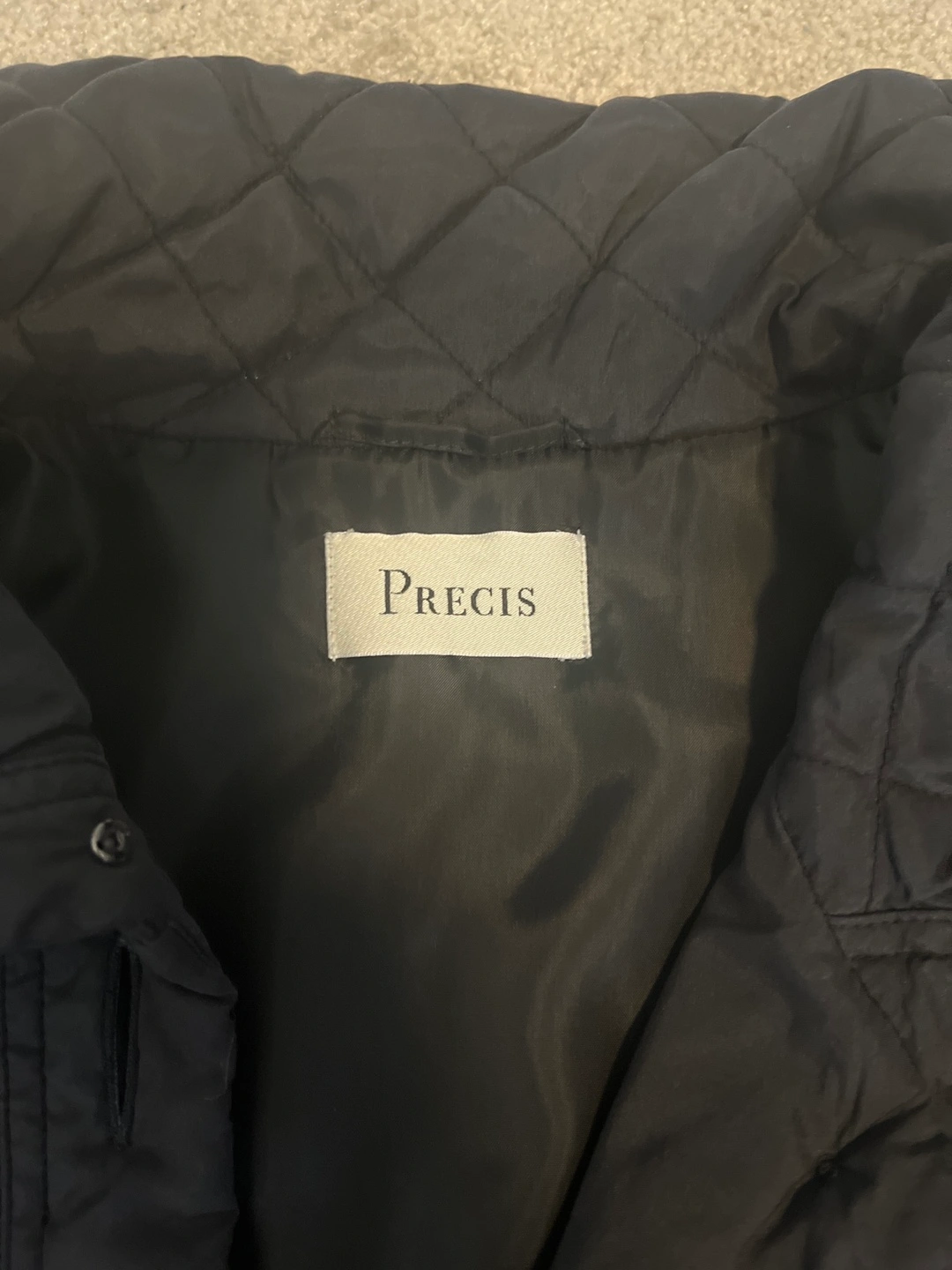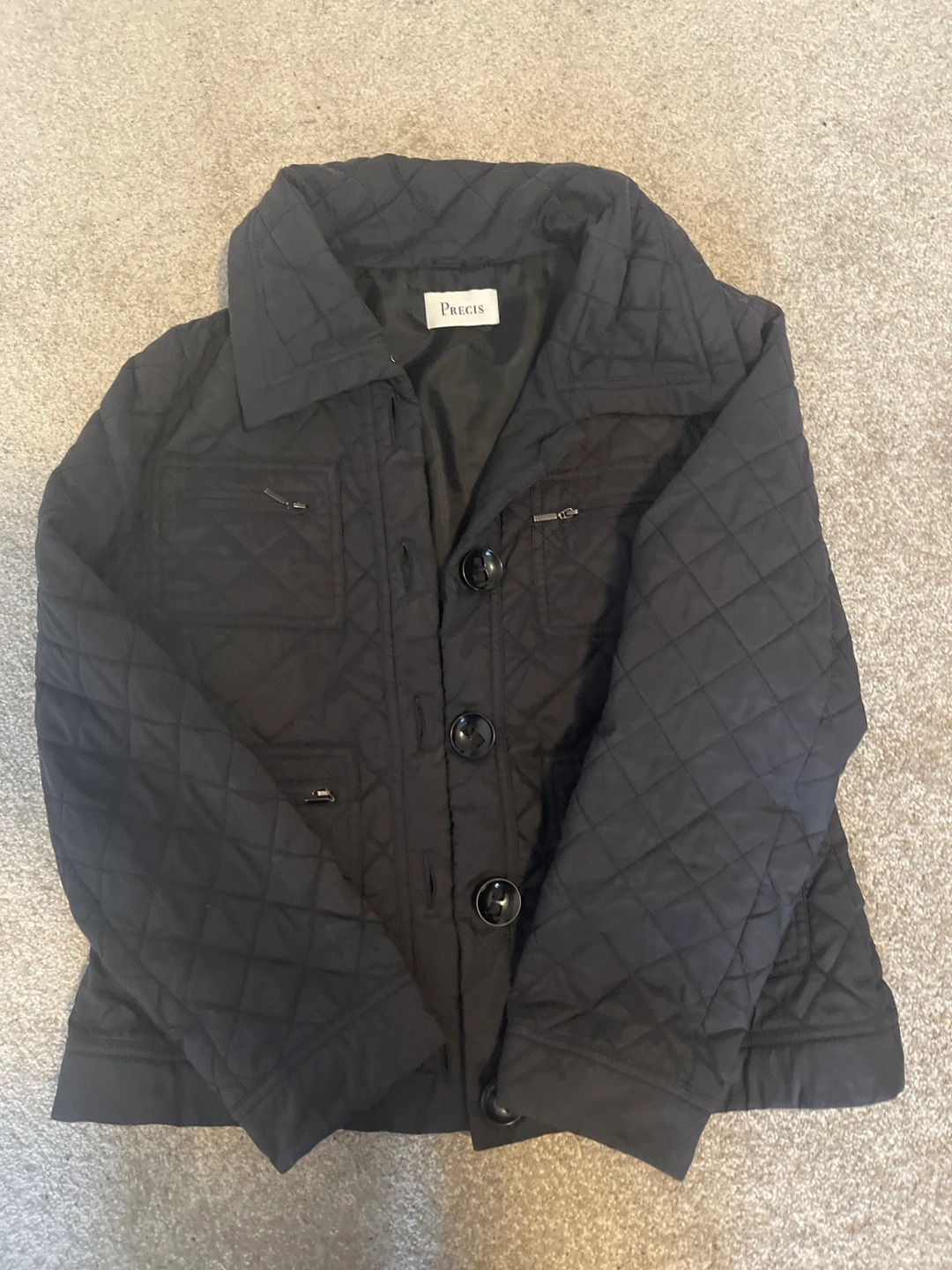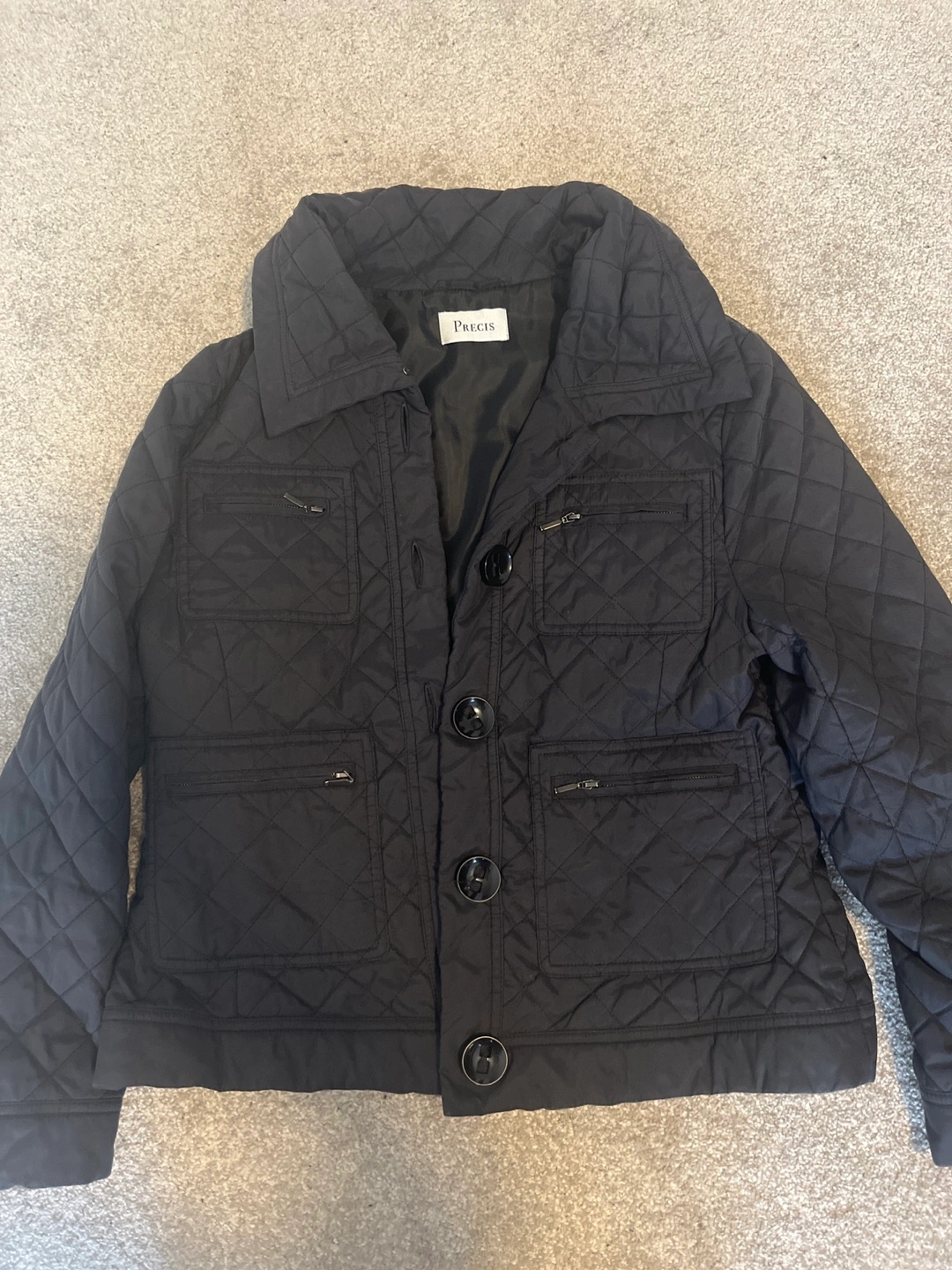 Black quilted jacket with multiple pockets and button closure. Size 10. New never used pet and smoke free home
