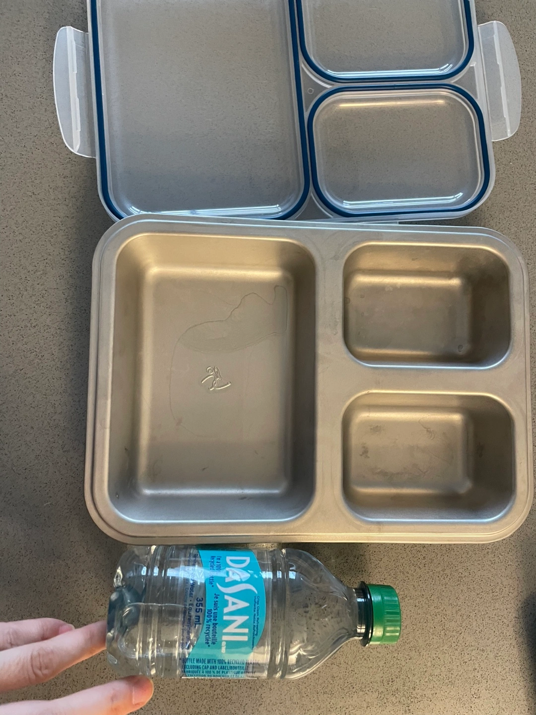 Stainless steel lunch box with a clear plastic lid. Four compartments. Microwave and freezer safe. Hand wash only.