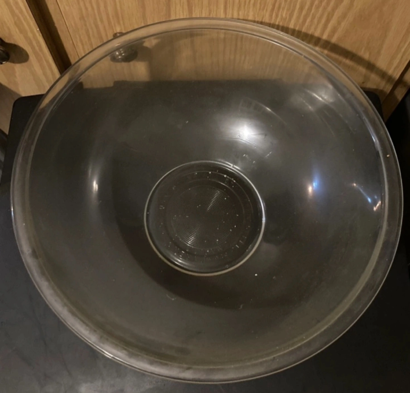 Large glass mixing bowl. Clear glass with a slight green tint.