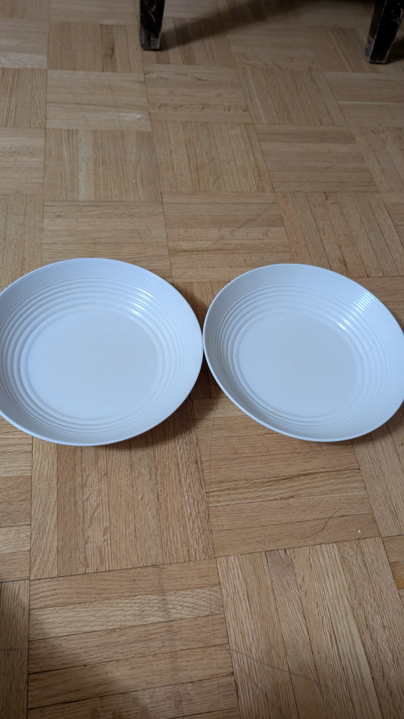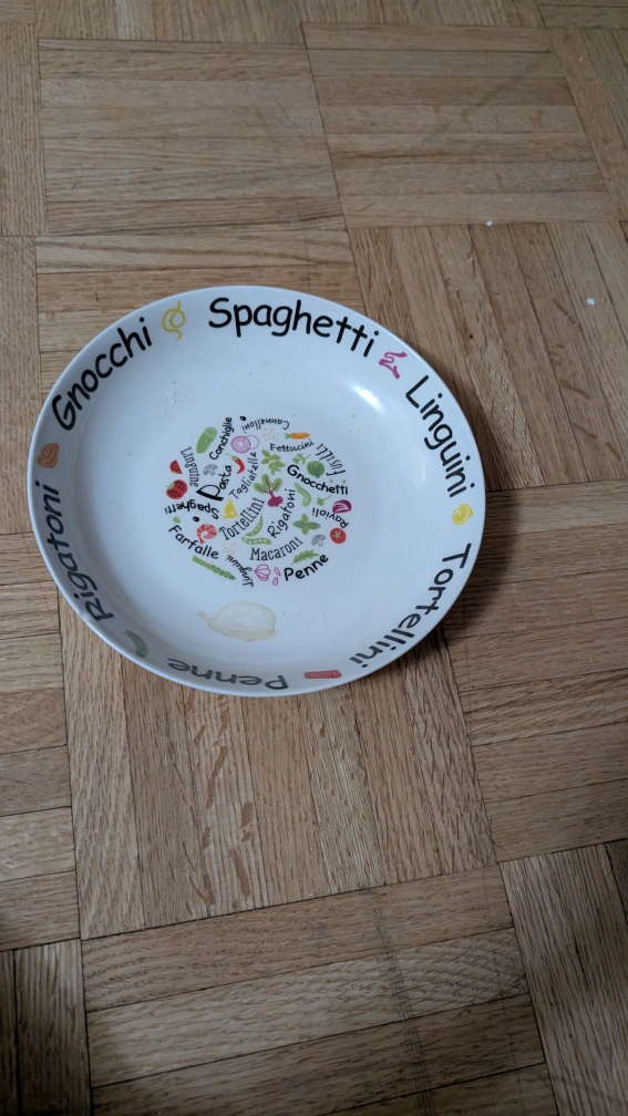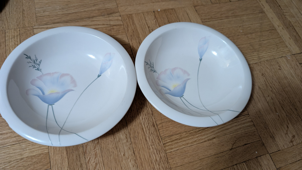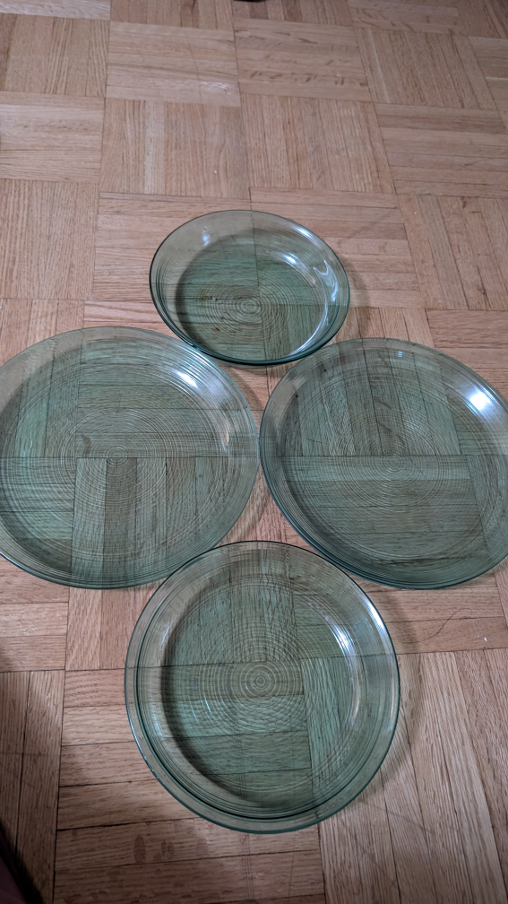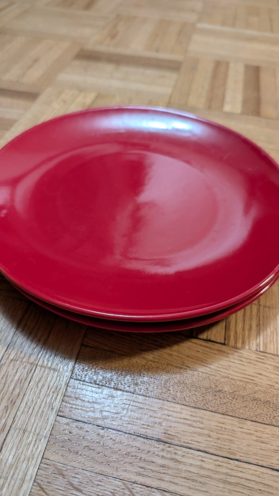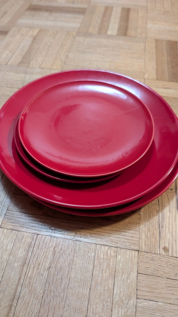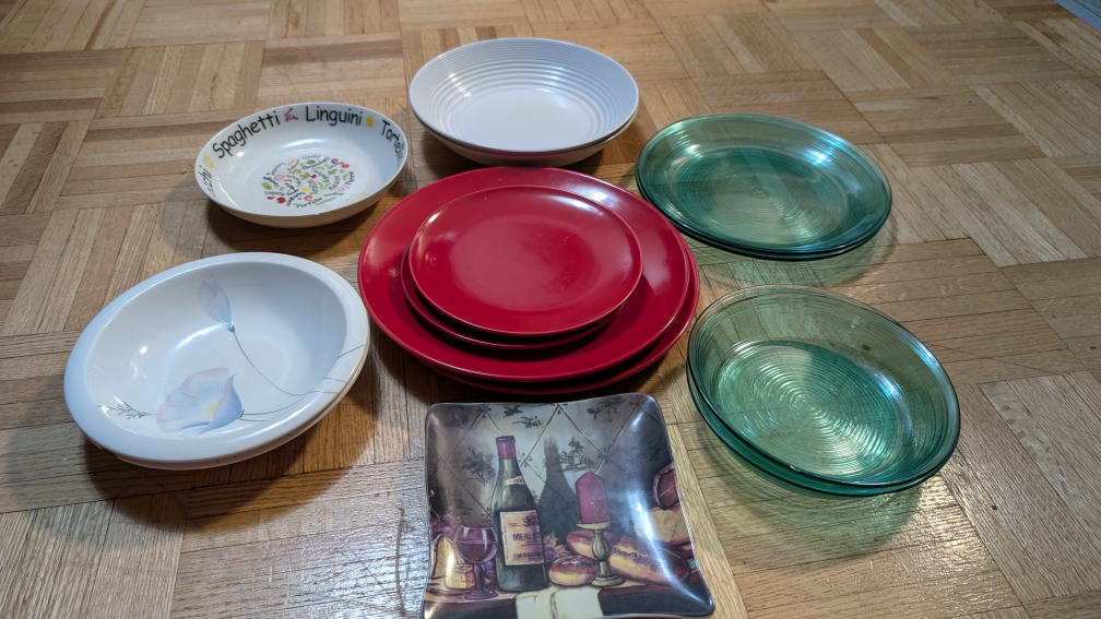 Set of Red Dinner plates, including pasta bowls, and a small square plate. Includes 2 white pasta bowls, 2 white bowls with floral design, 4 green glass plates.