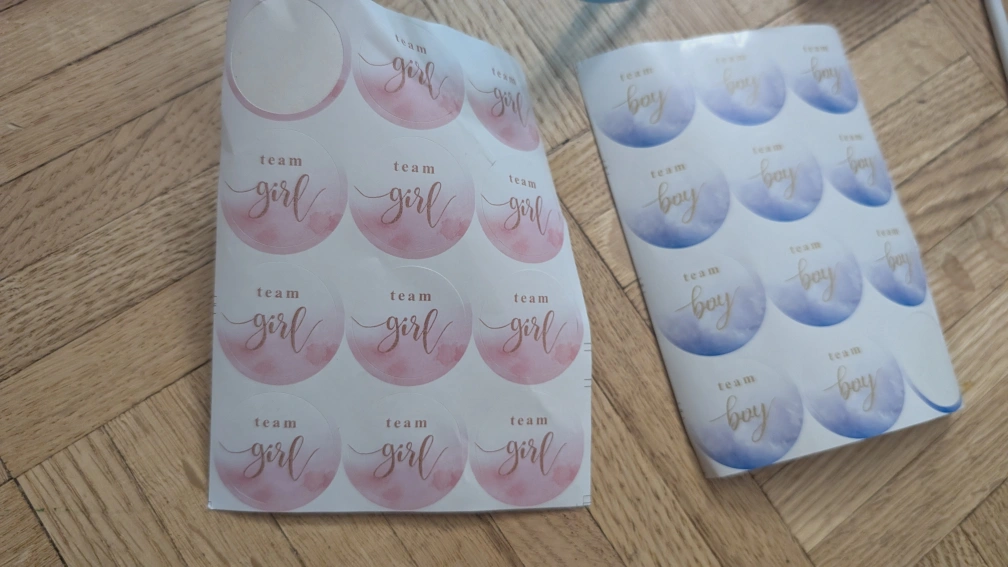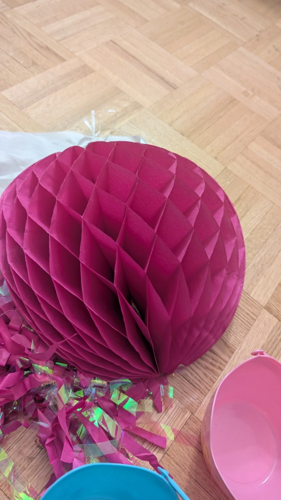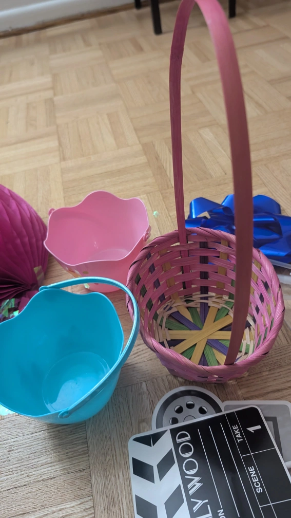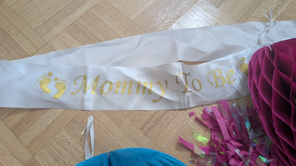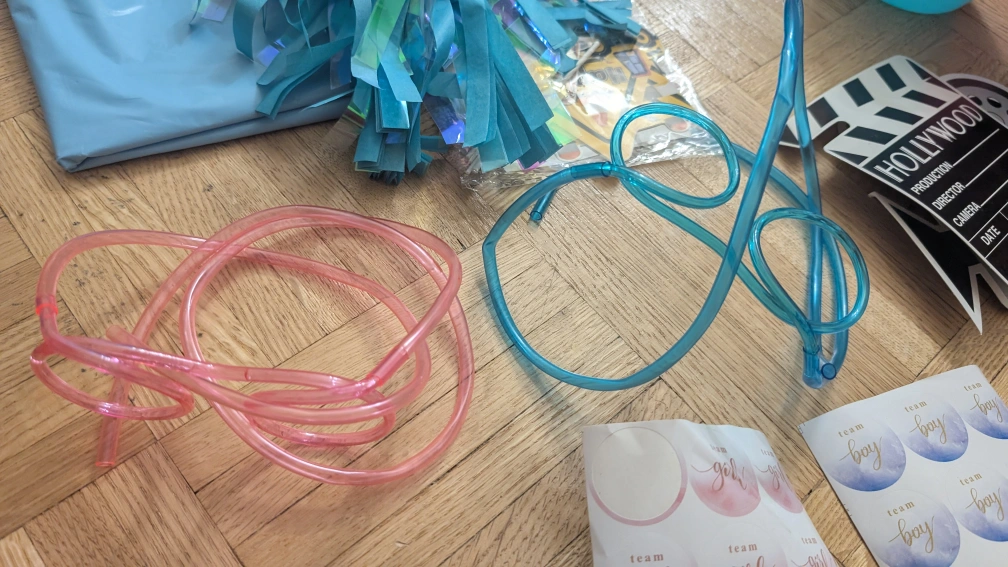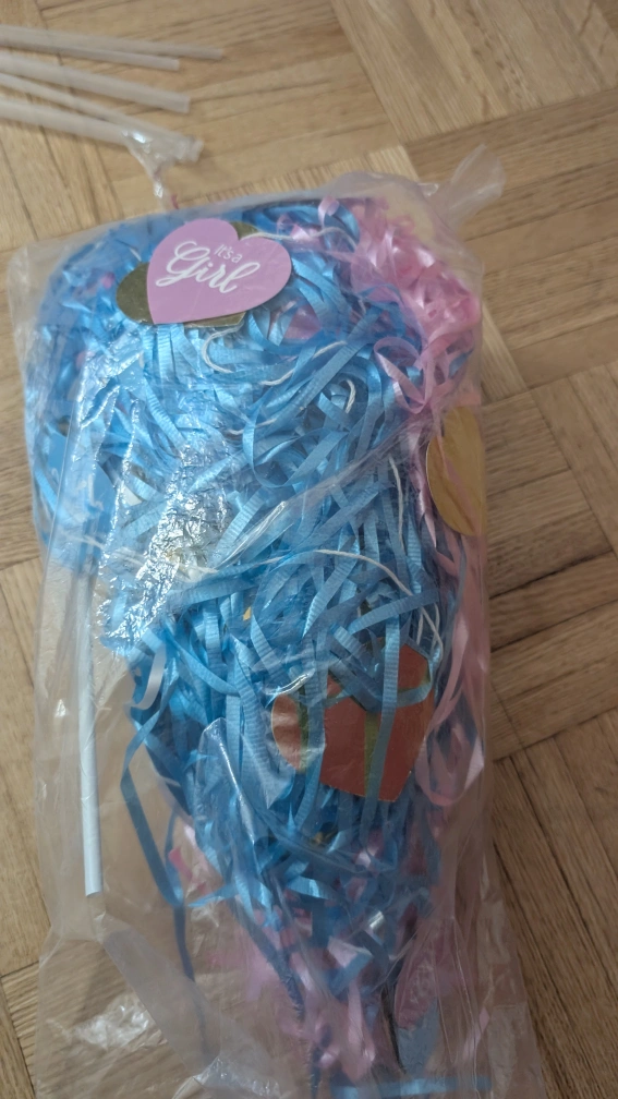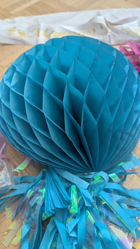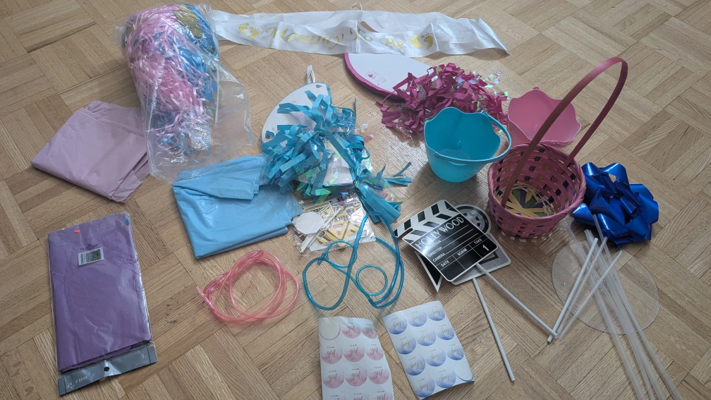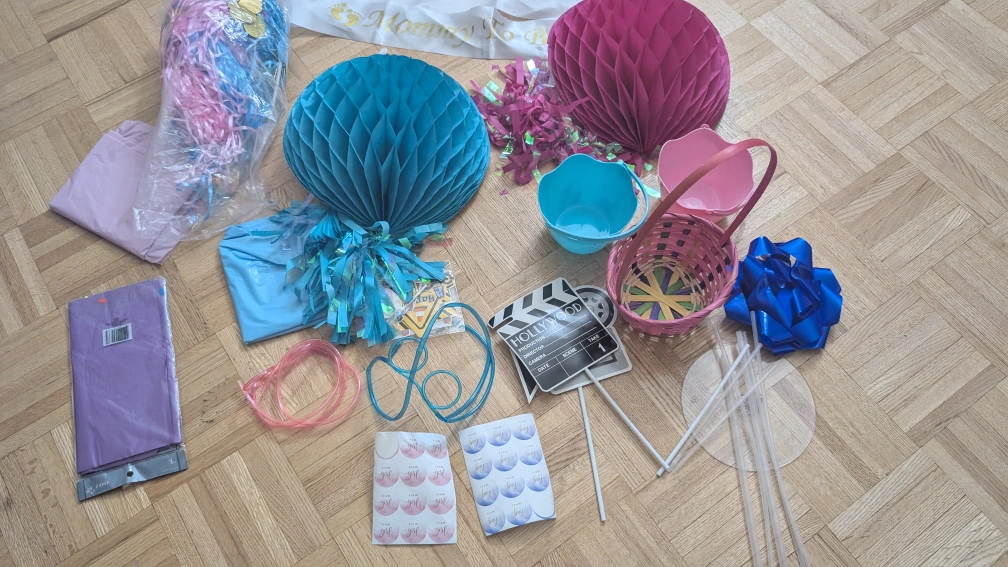 Decorations for gender reveal. Includes two honeycomb balls, streamers, a Mommy to Be sash, a basket, two plastic bowls, a tablecloth, 15 stickers and two Hollywood-style signs and pink and blue backdrops.