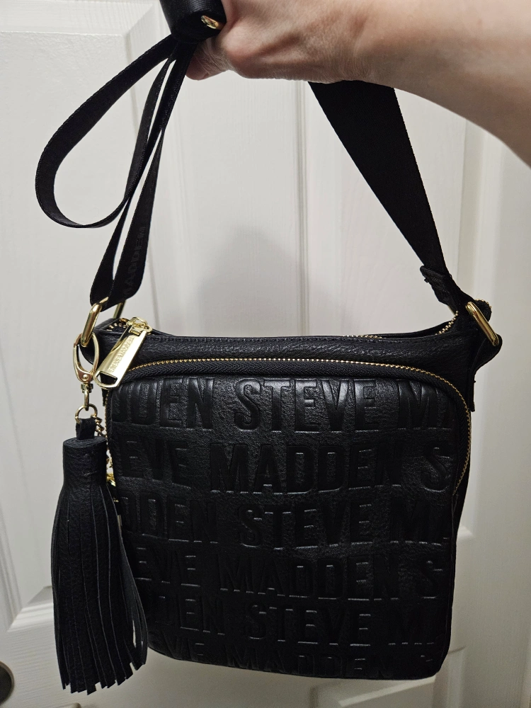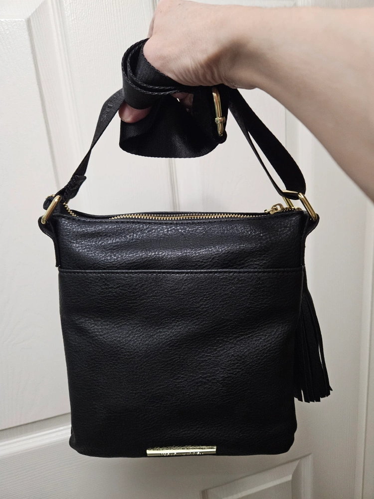 Black crossbody bag with gold hardware. It has a small tassel attached to the zipper pull. The bag has a zip closure and a small pocket on the back. The adjustable strap is made of black fabric.