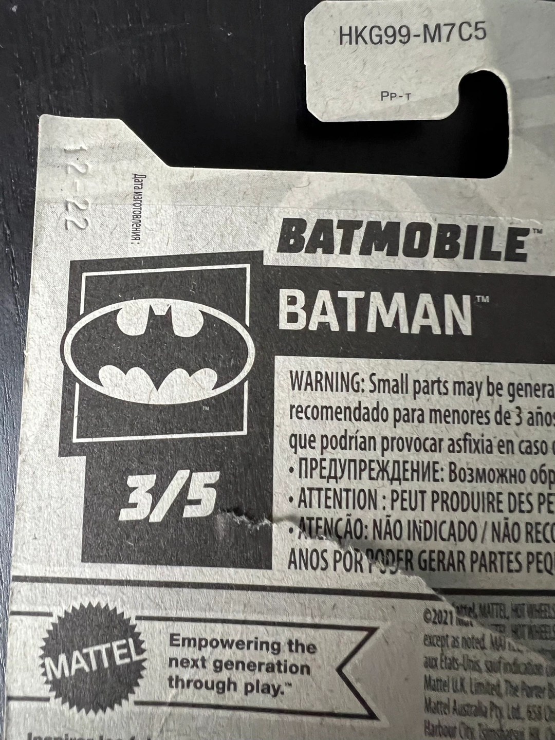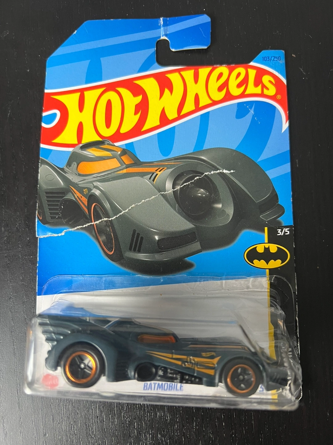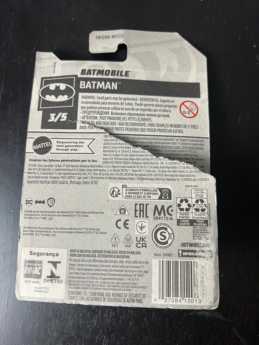 Selling this Hot Wheels Batmobile (3/5) – the car is in perfect condition, but the packaging is a bit damaged. A great addition to any collection!