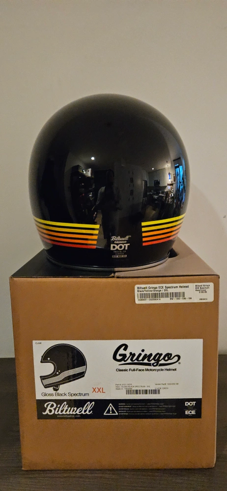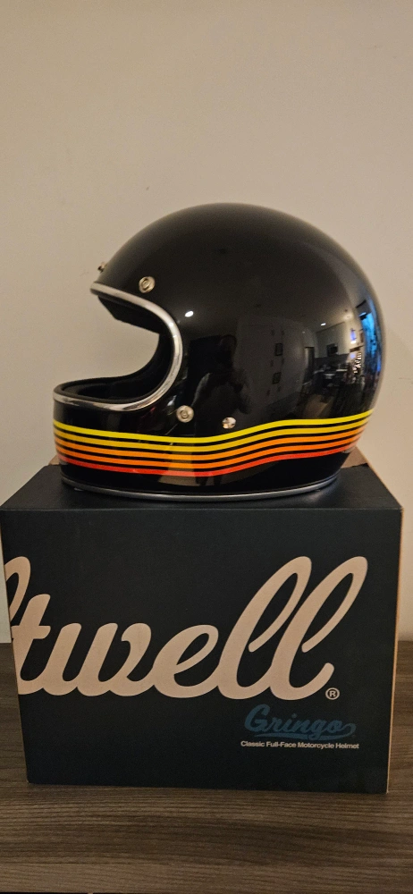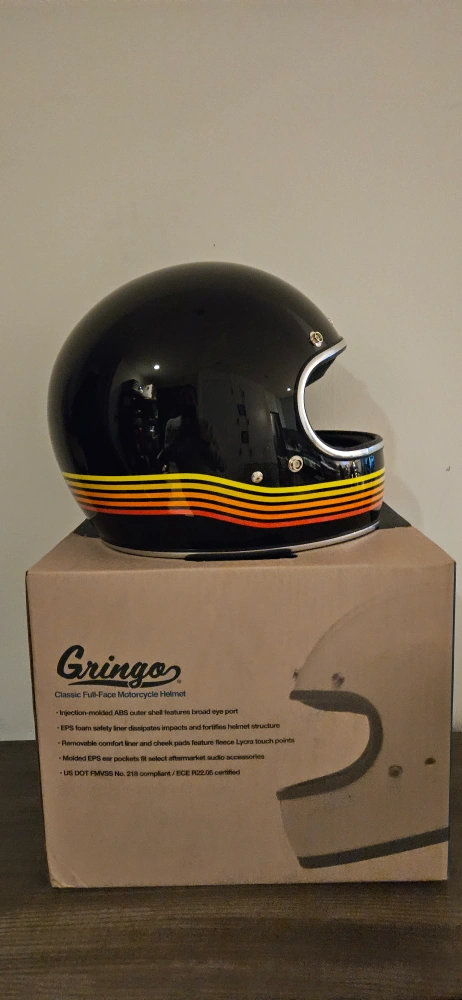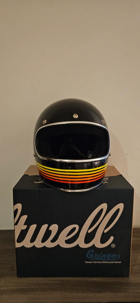 Classic full-face motorcycle helmet. Black with yellow, orange, and red stripe design. Injection-molded ABS outer shell. Removable comfort liner and cheek pads feature fleece Lycra touch points. Molded EPS ear pockets. DOT and ECE certified.