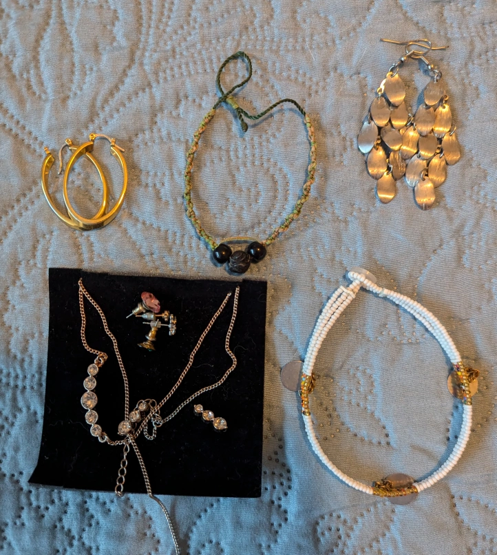 various jewelry: a gold hoop earring pair, a silver teardrop earring pair, and a gold chain necklace. Also includes a white beaded bracelet and a green string bracelet.