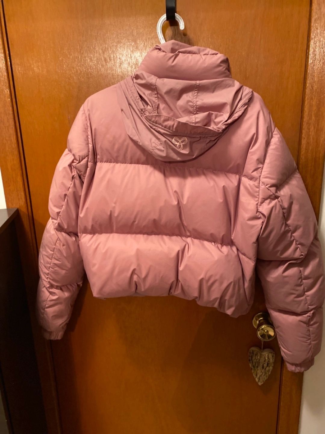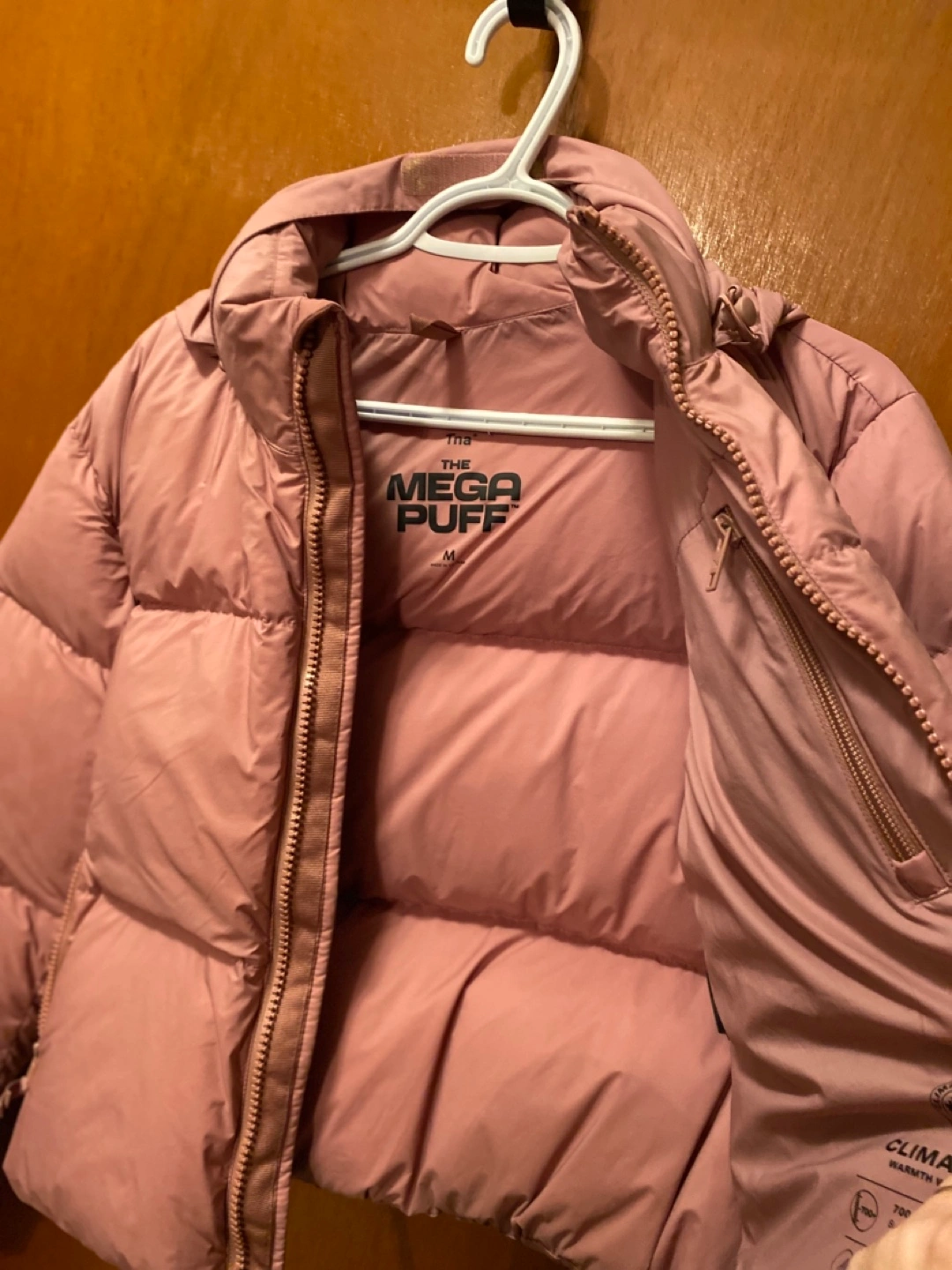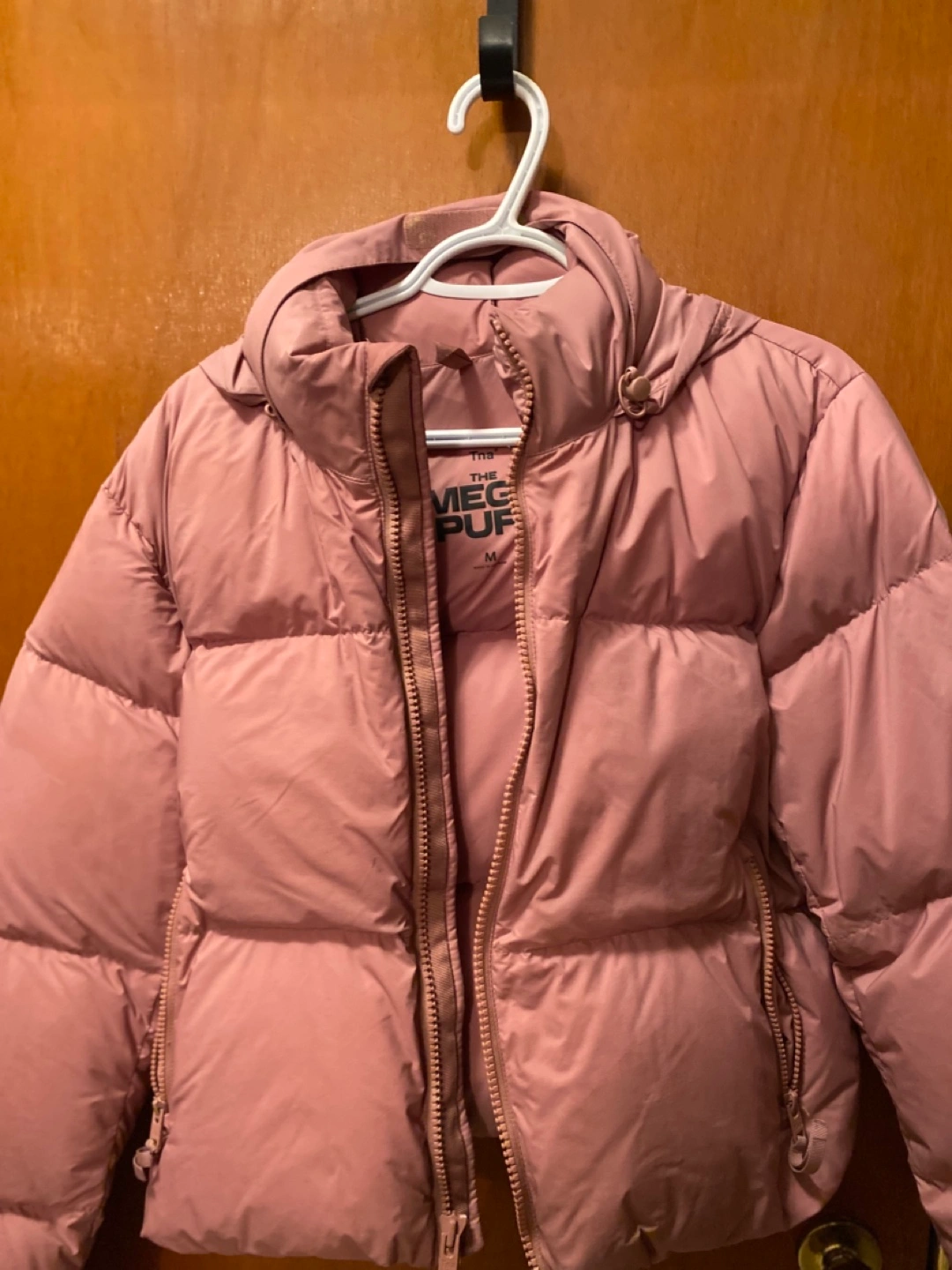 Pink puffer jacket with a hood. Size M. Features Climate Lab technology. Used. Like New. Pick up at Dufferin and St. Clair.