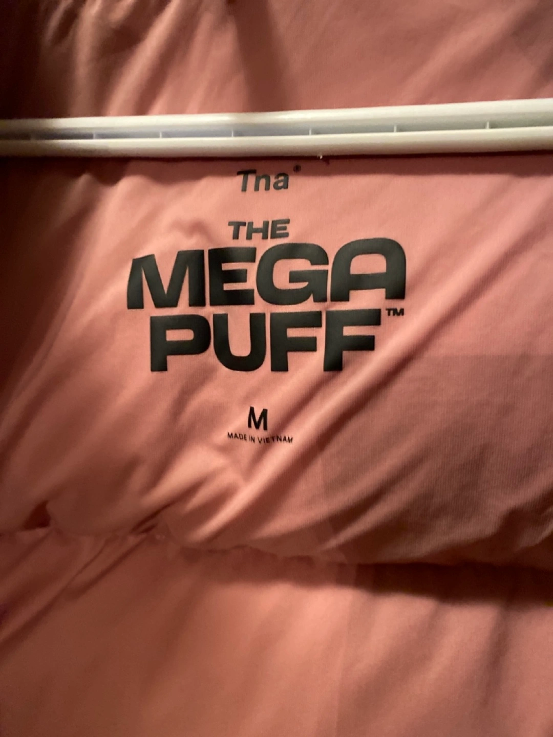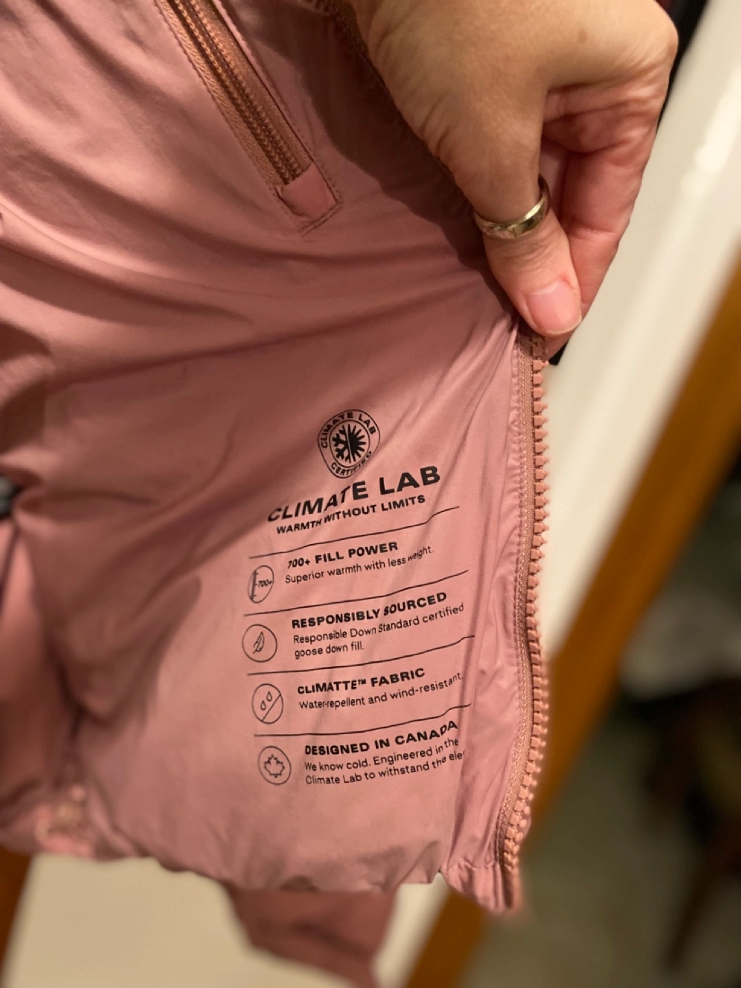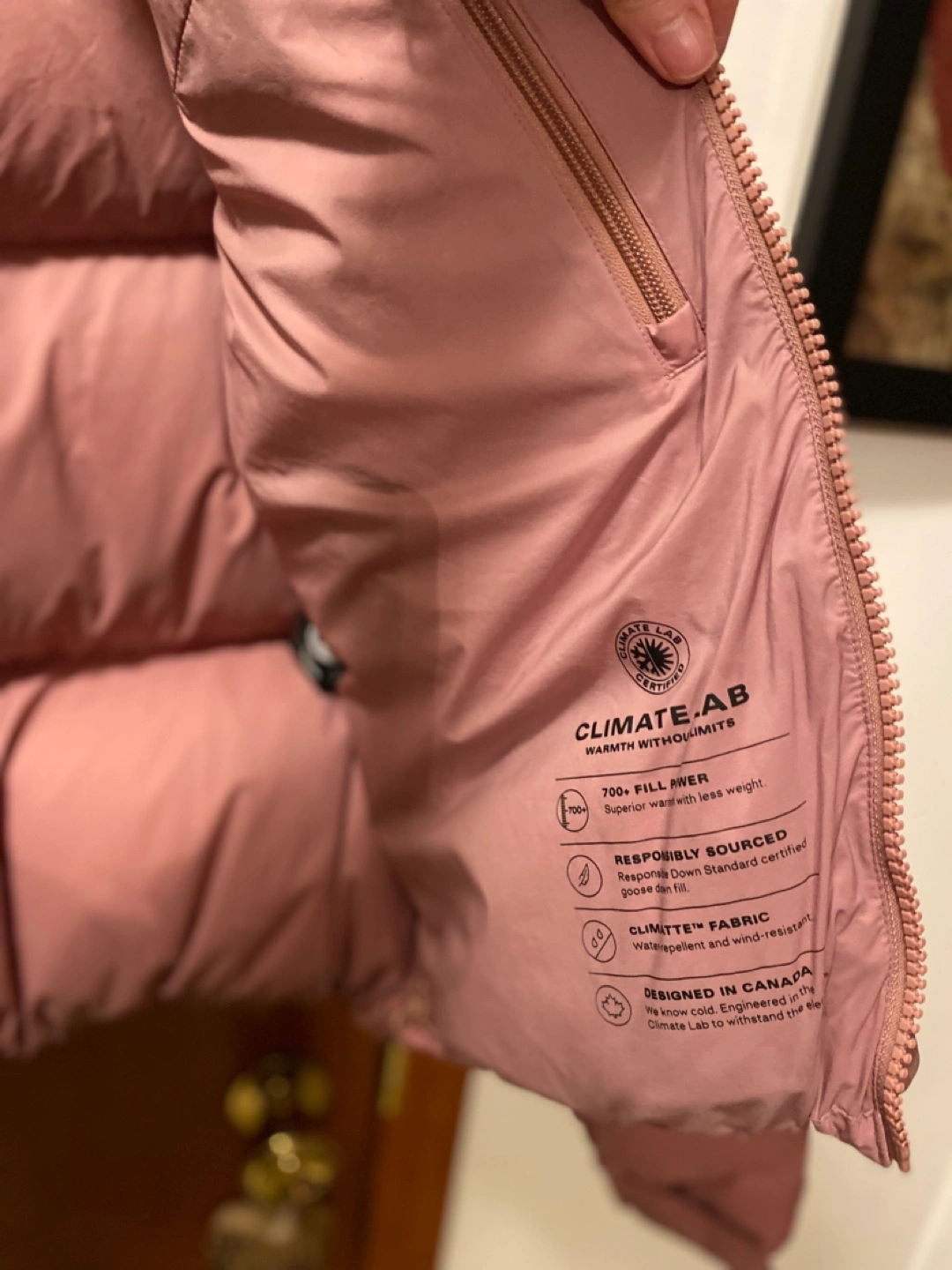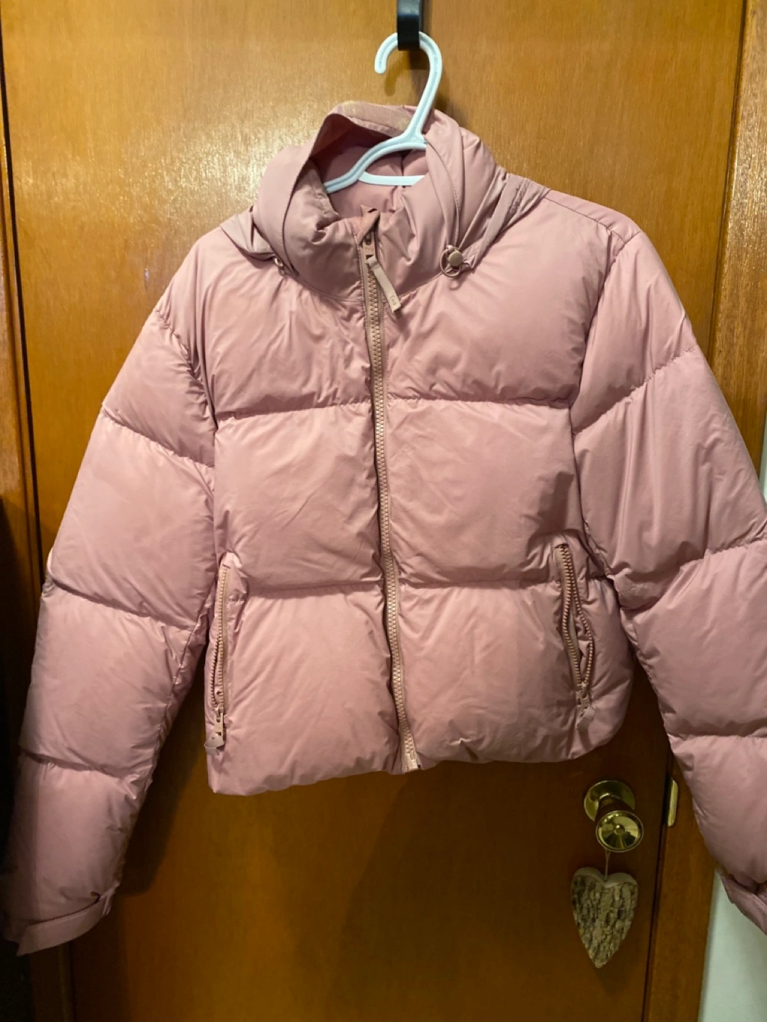 Pink puffer jacket with a hood. Size M. Features Climate Lab technology. Used. Like New. Pick up at Dufferin and St. Clair.