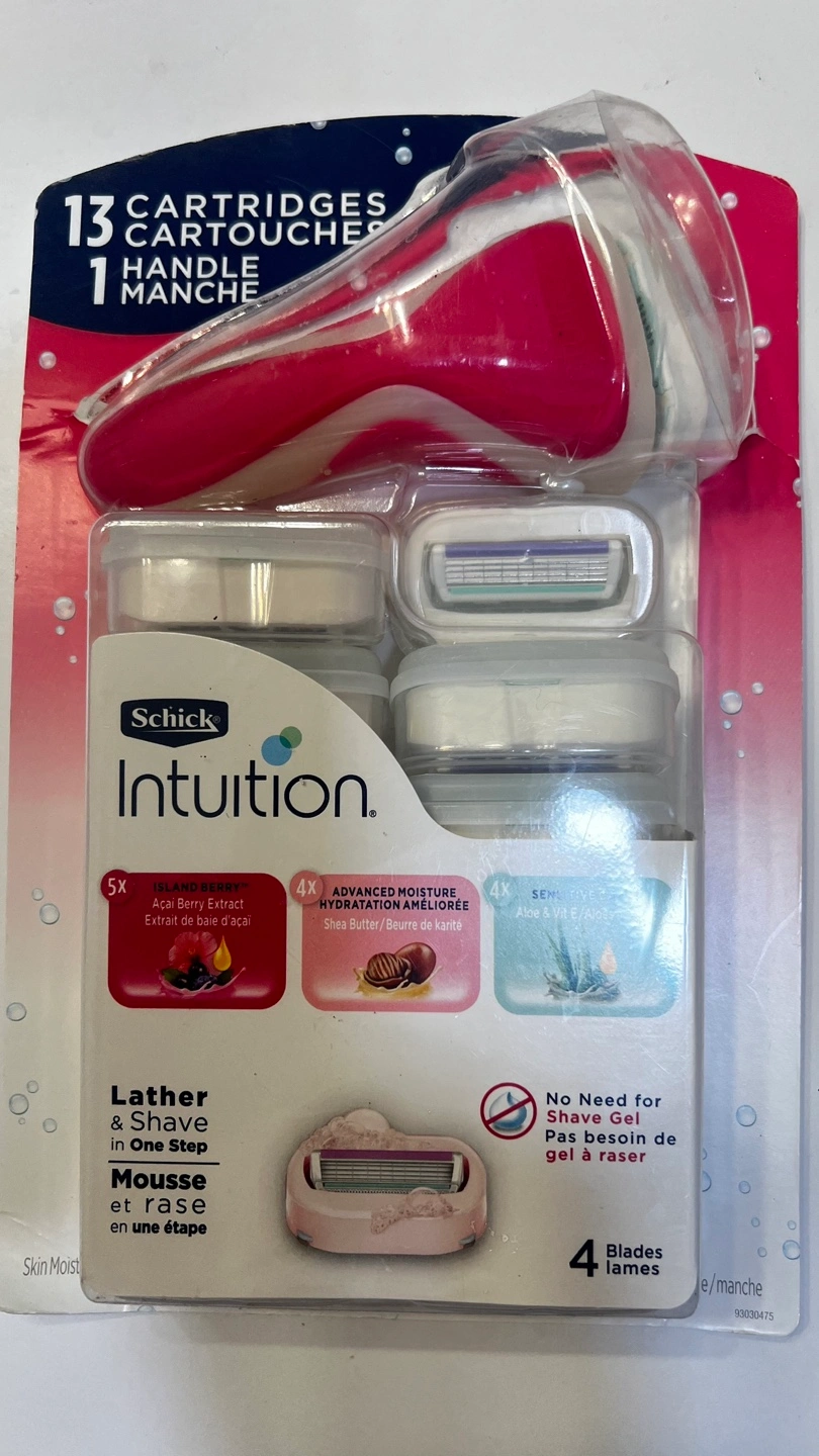 13 cartridges, 1 handle, 4 blades, lather and shave in one step. Features: Acai berry extract, shea butter, and aloe vera.