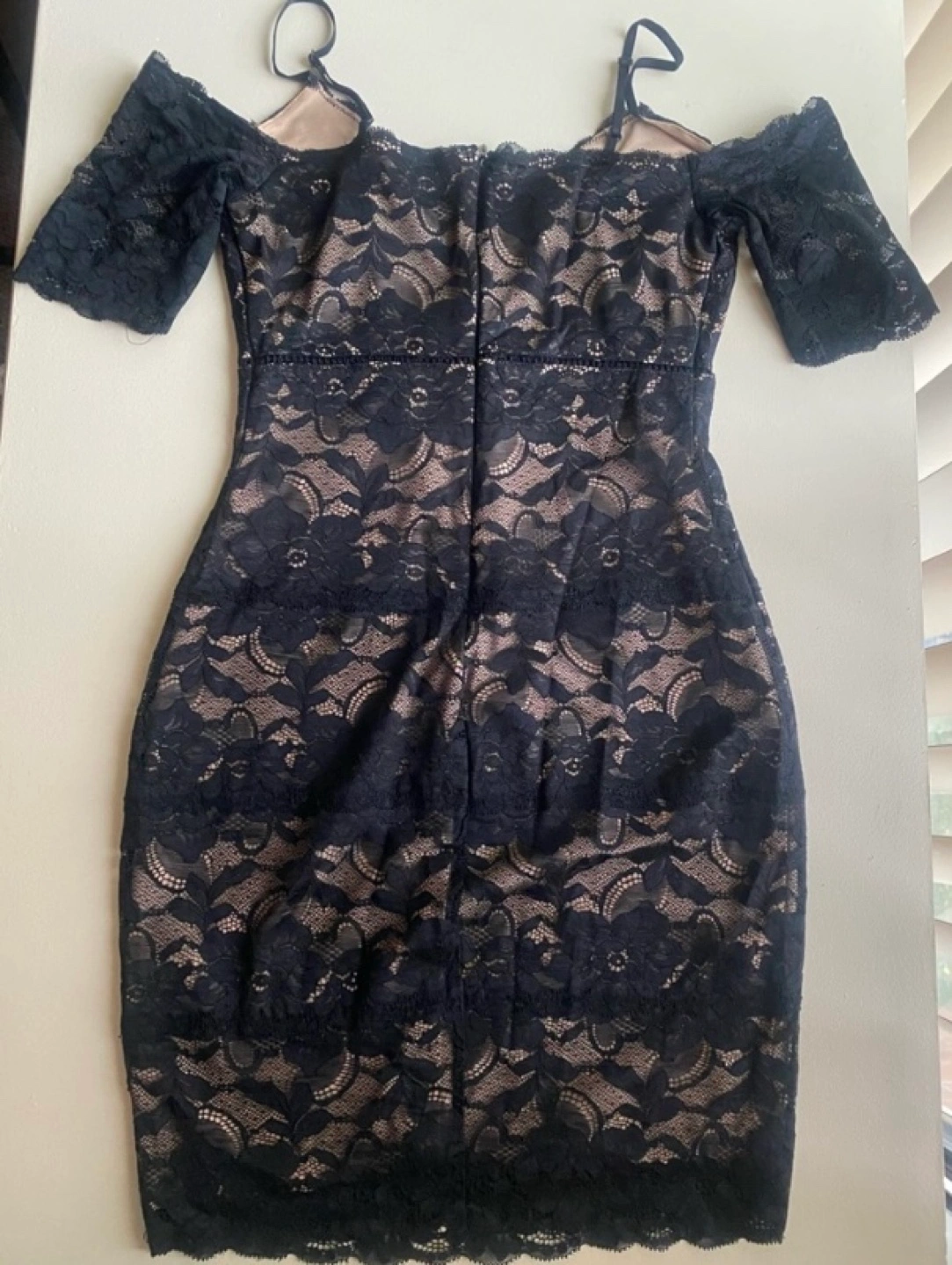 It features a Chantilly type lace pattern with a nude underlay. Also, a flattering v neckline and off the shoulder sleeves make for a flattering silhouette.