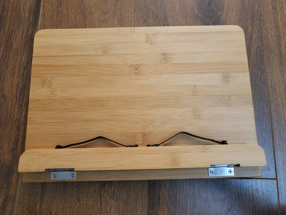 Adjustable book stand, made from bamboo. Perfect for reading books, cookbooks, or tablets. Folds for easy storage. 13" by 9.5"