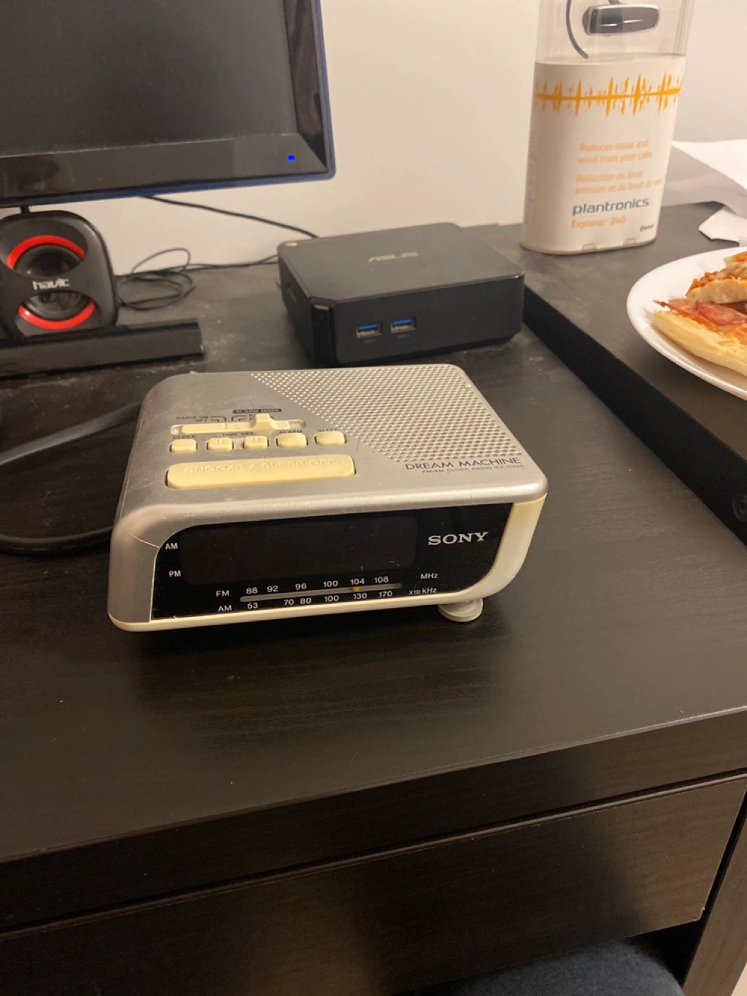 Silver clock radio with AM/FM tuning, alarm clock function, and sleep timer.My mom brought alarm clock since 20 year ago it for cost $39.99.