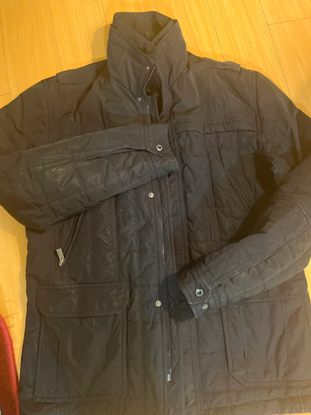460Navy quilted winter jacket with zipper and button closure. Two large pockets in the front. Long sleeves with button cuffs.