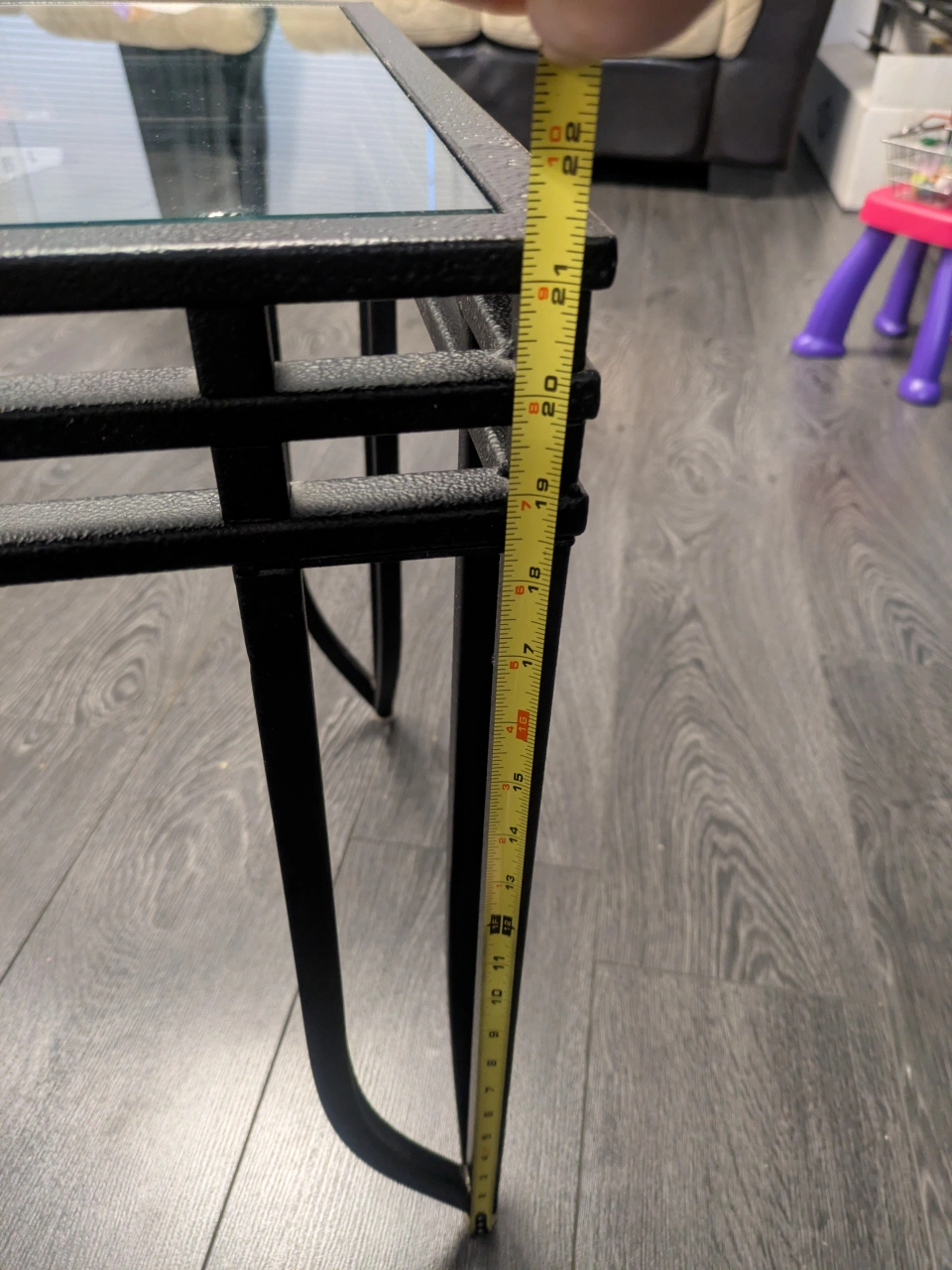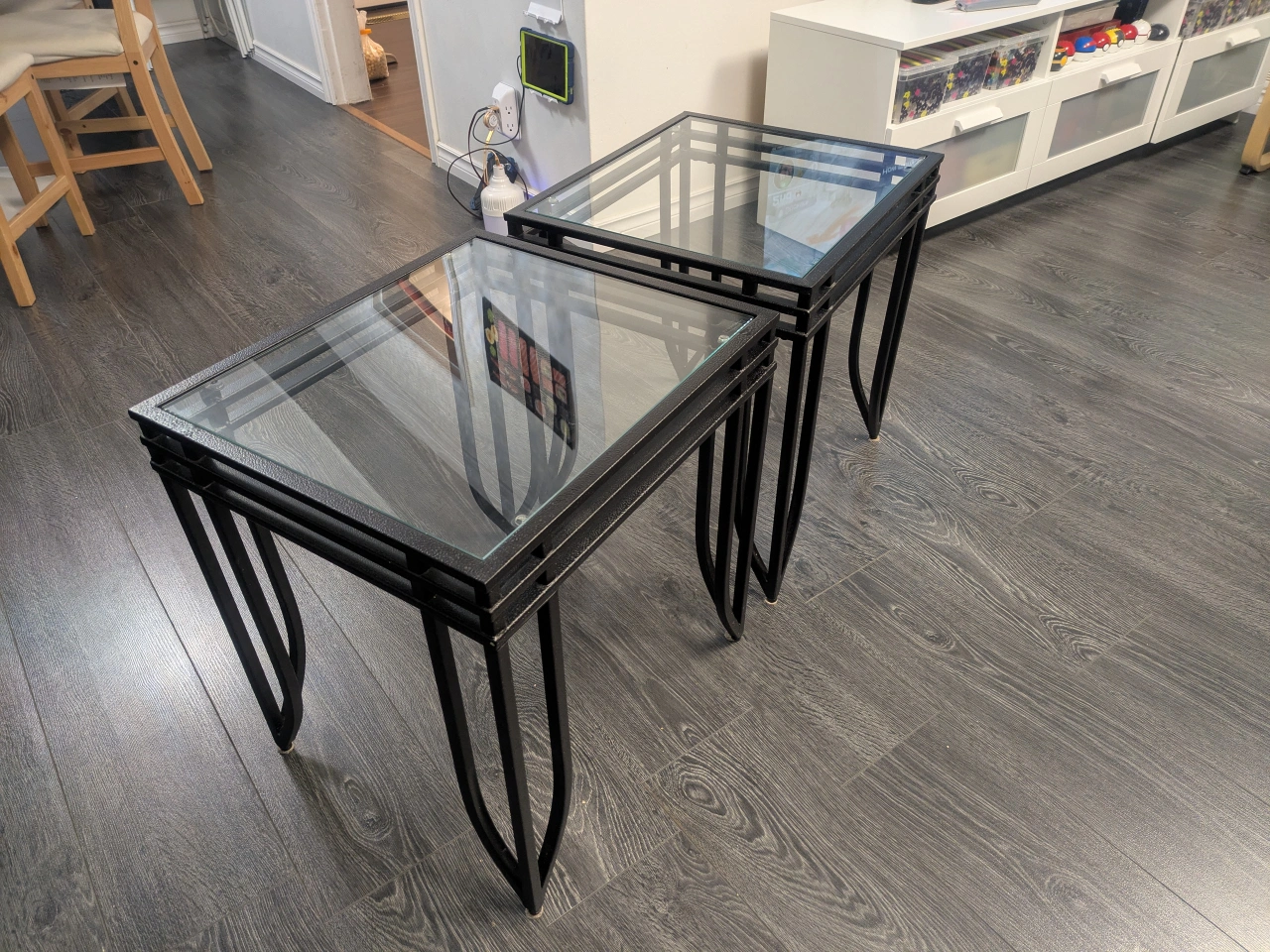 Set of 2 square glass top coffee tables with black metal frames. Dimensions are in the pictures.