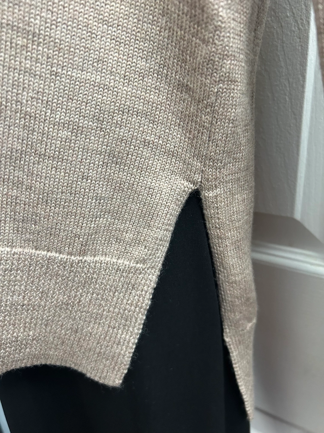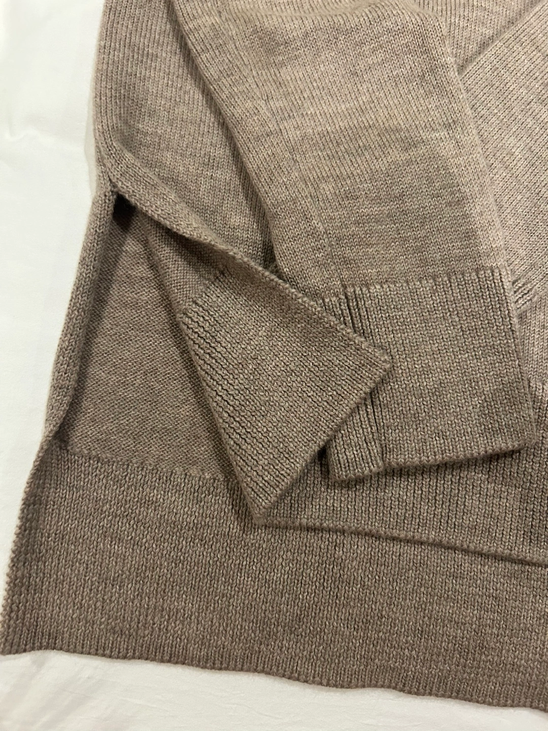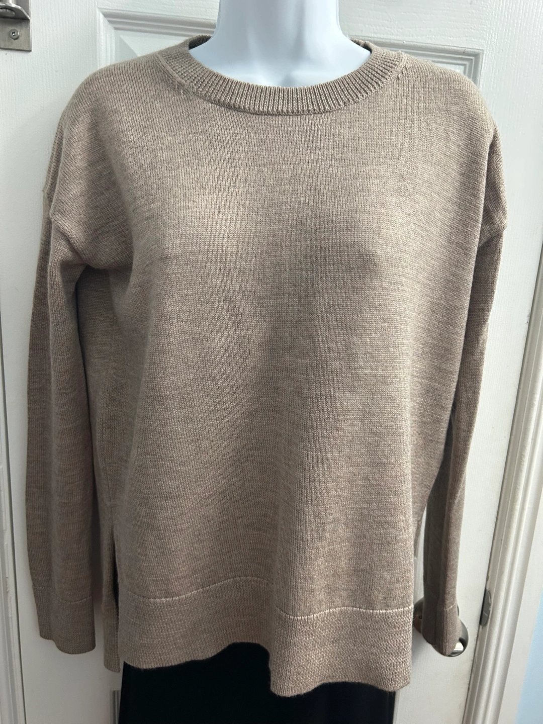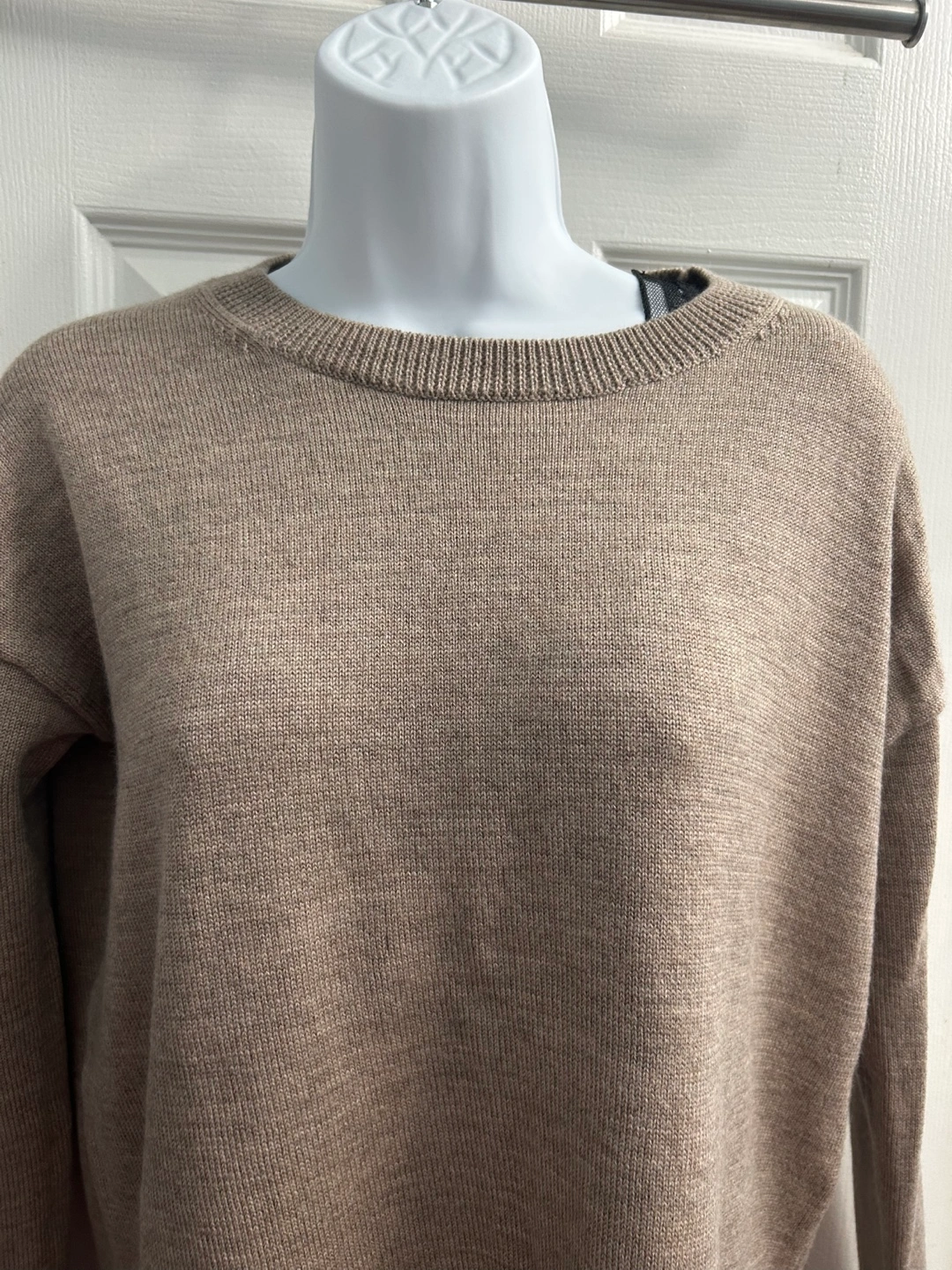 1000+Long-sleeved, brown sweater with a round neckline. The sweater is a relaxed fit and has side slits.