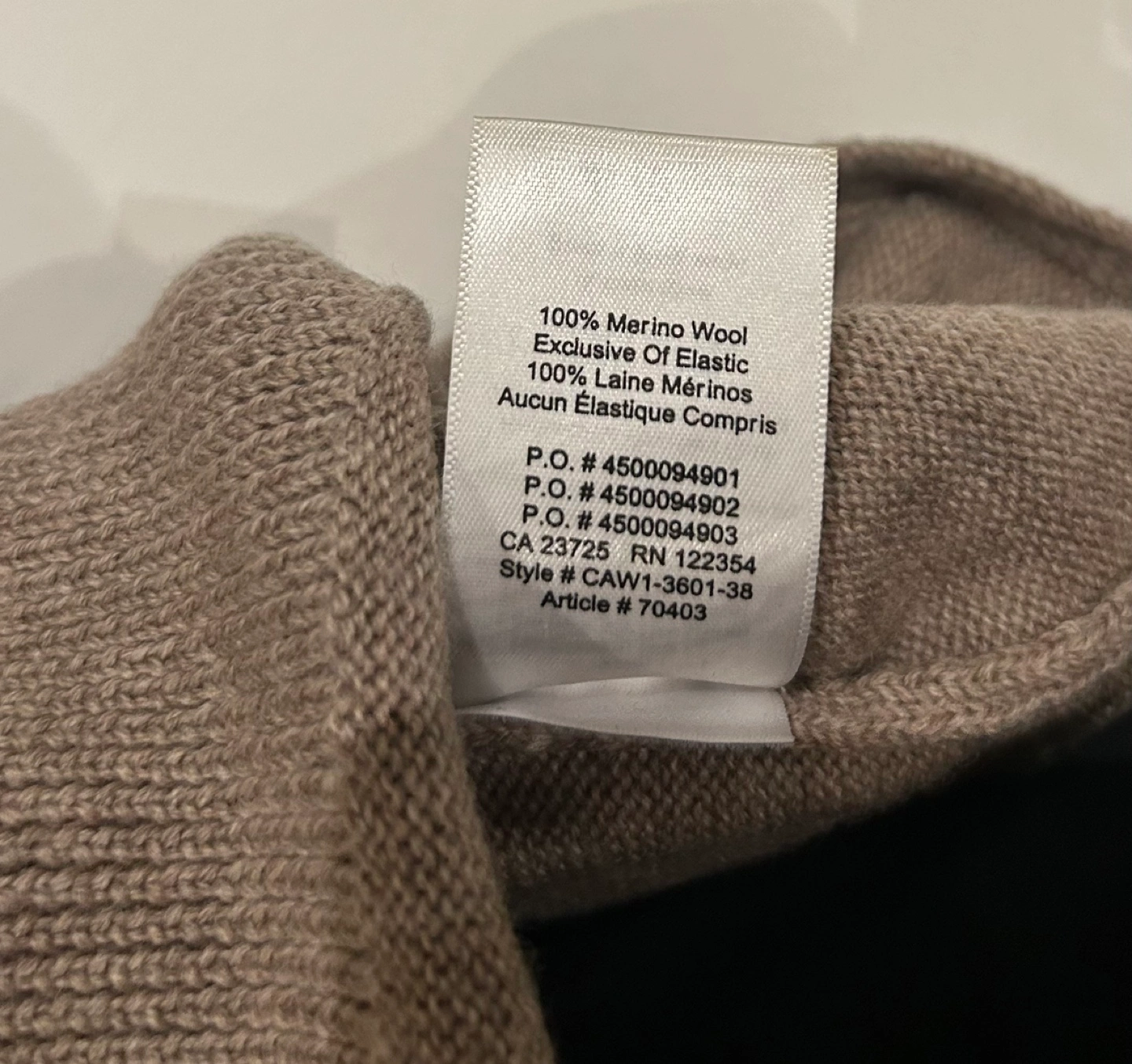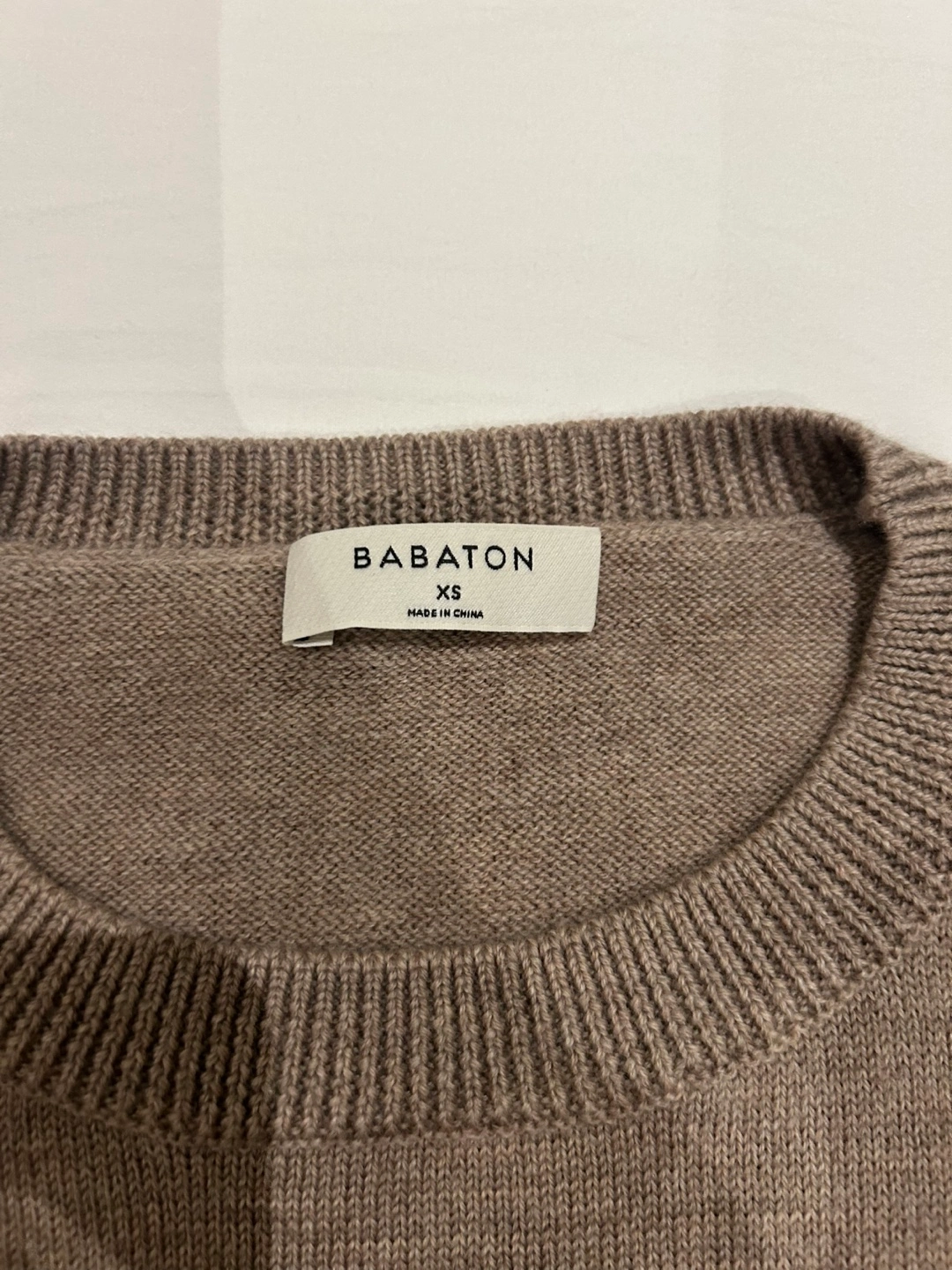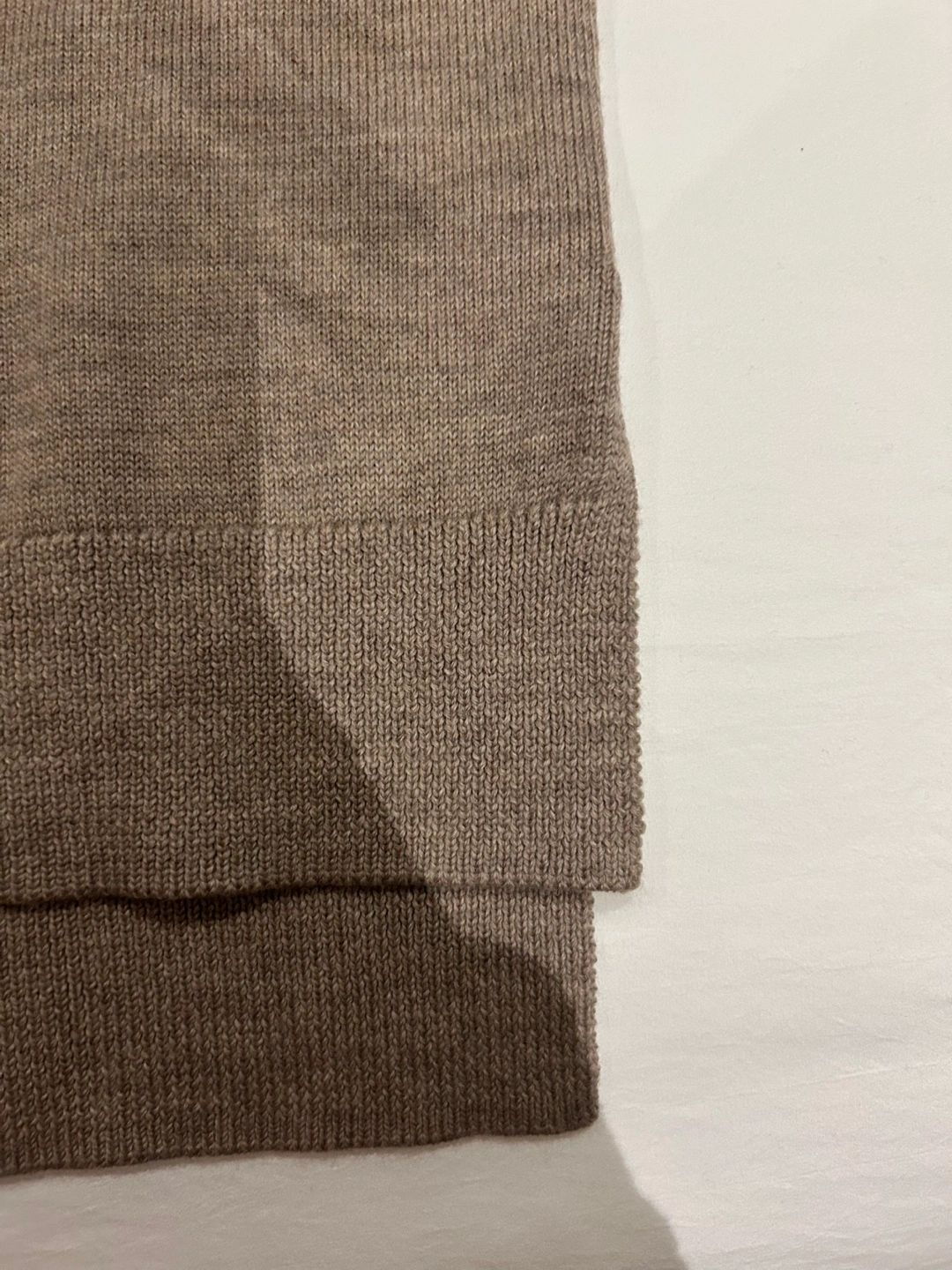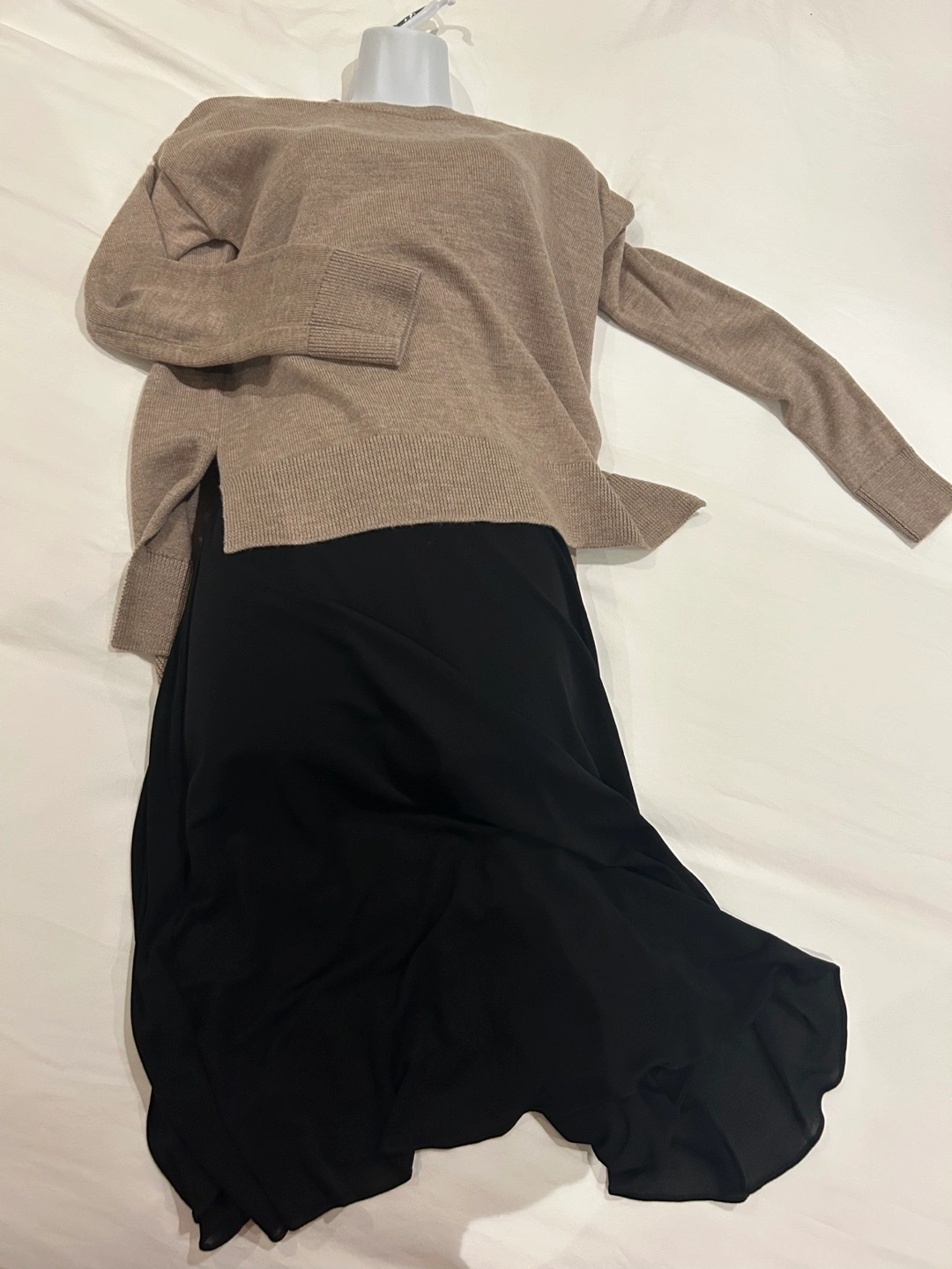 1000+Long-sleeved, brown sweater with a round neckline. The sweater is a relaxed fit and has side slits.