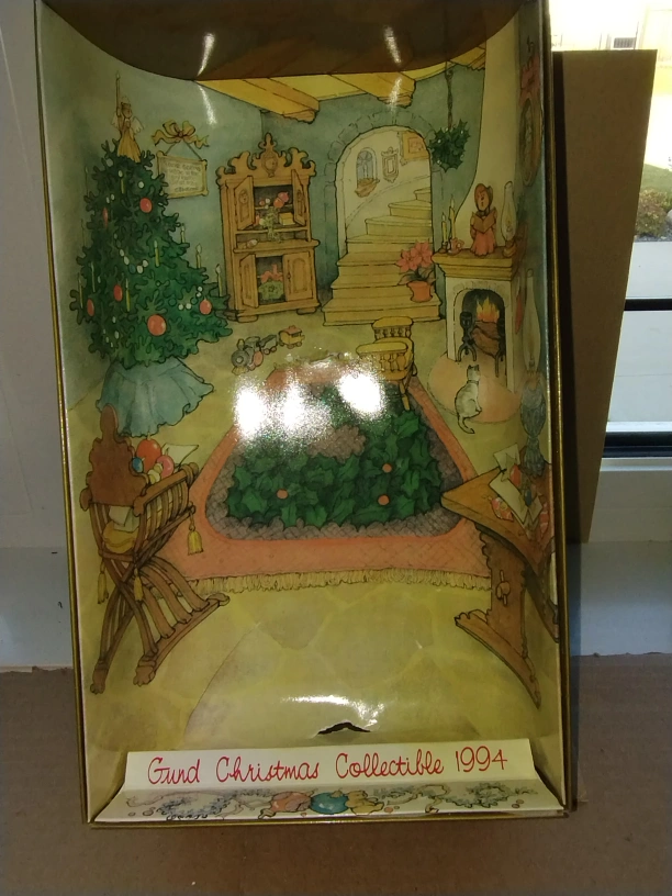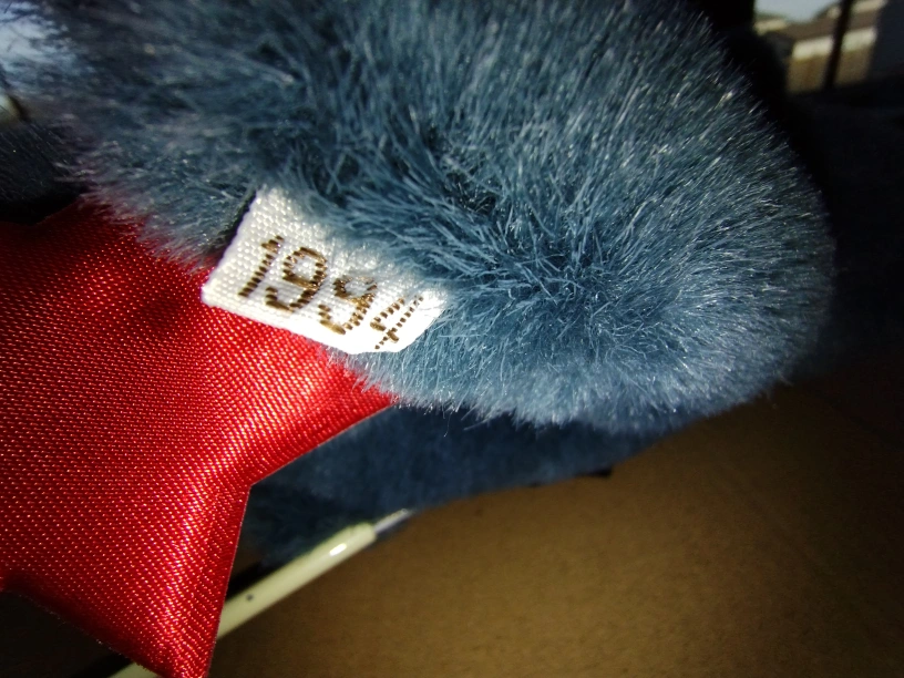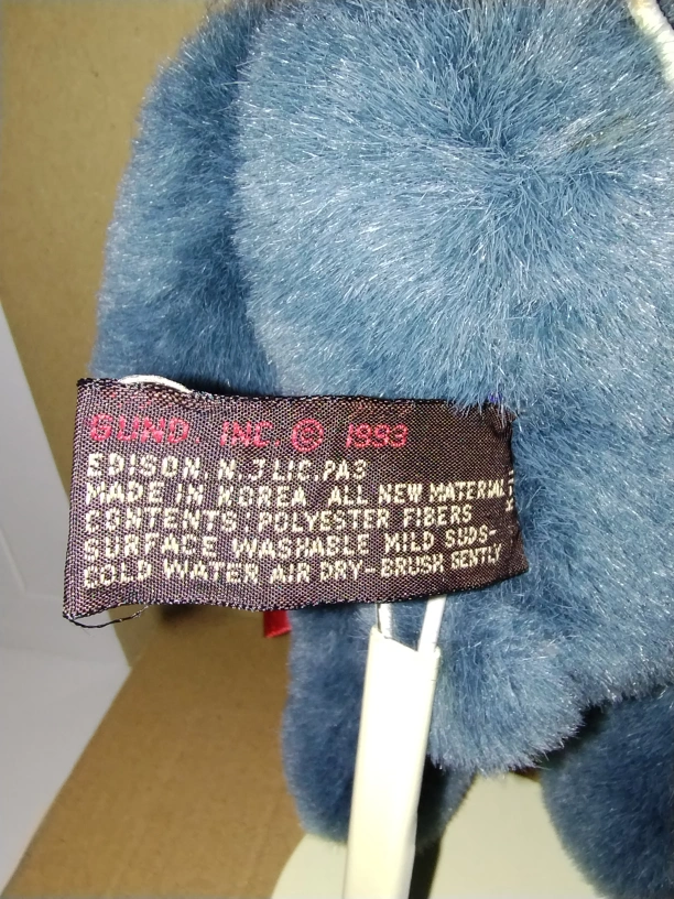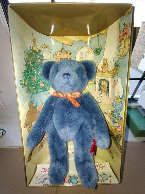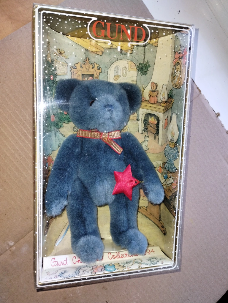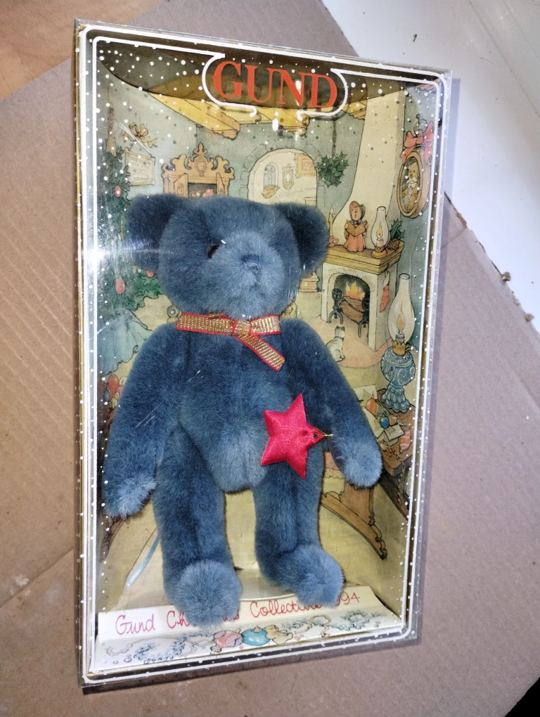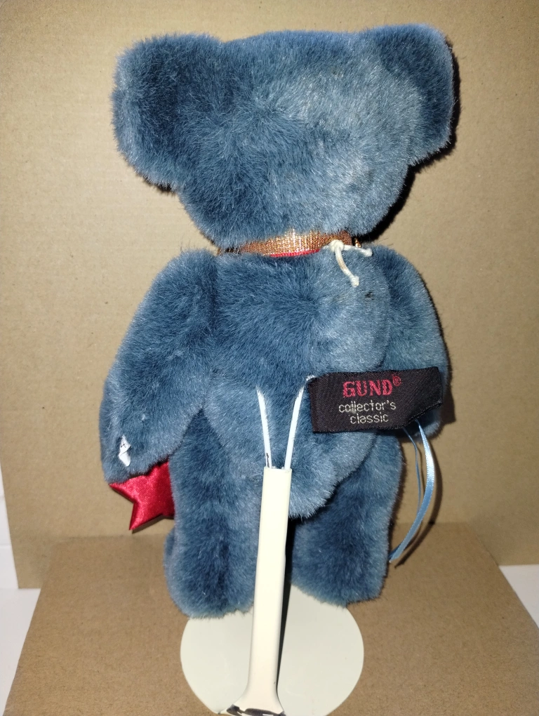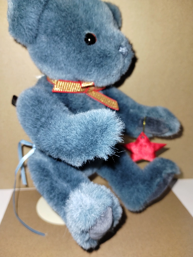 Blue plush teddy bear with red star and gold ribbong. Comes in original box.1994 Christmas special edition GUND bear in the original box.