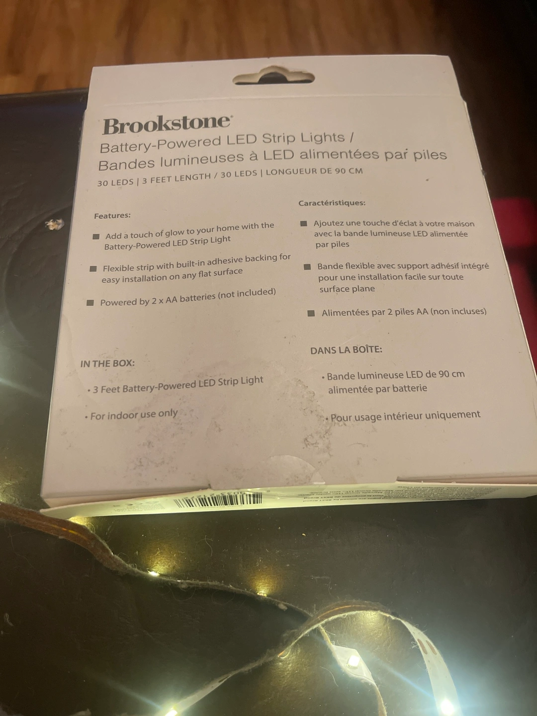 30 LEDs, 3 foot length, battery-powered LED strip lights. Indoor use only. Includes 2 AA batteries and original package