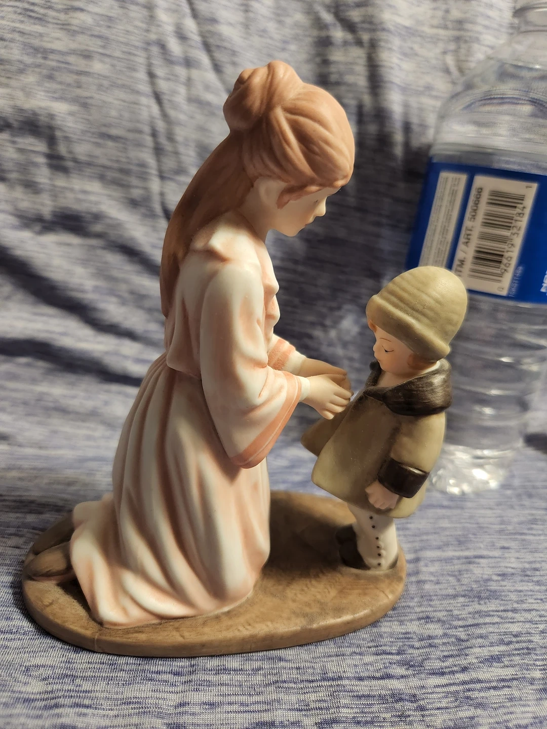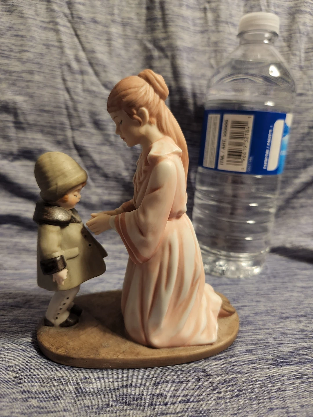 Vintage Enesco Treasured Memories Dressing Warm Porcelain Figurine. Mother kneeling down helping child to put on her winter coat.