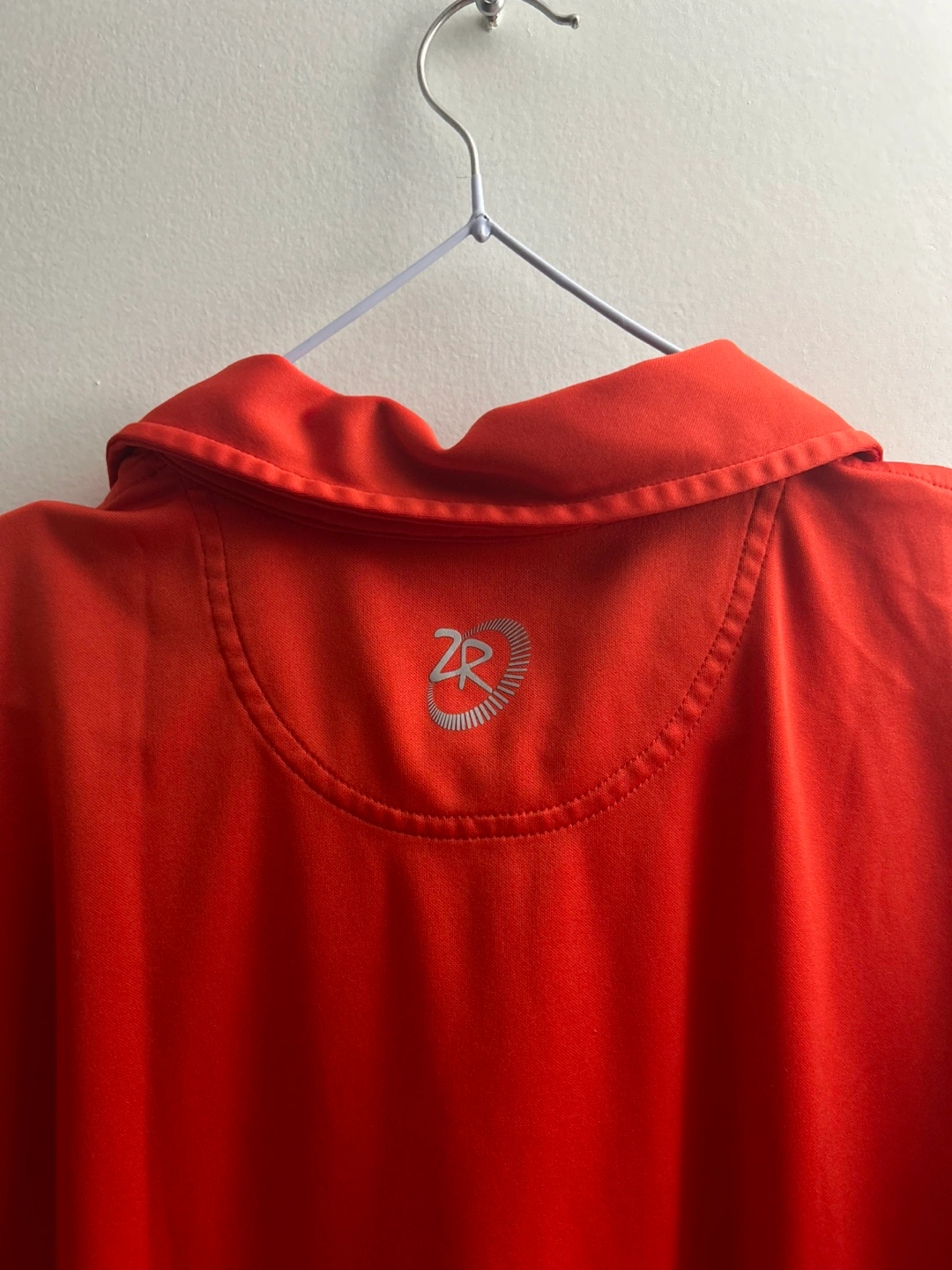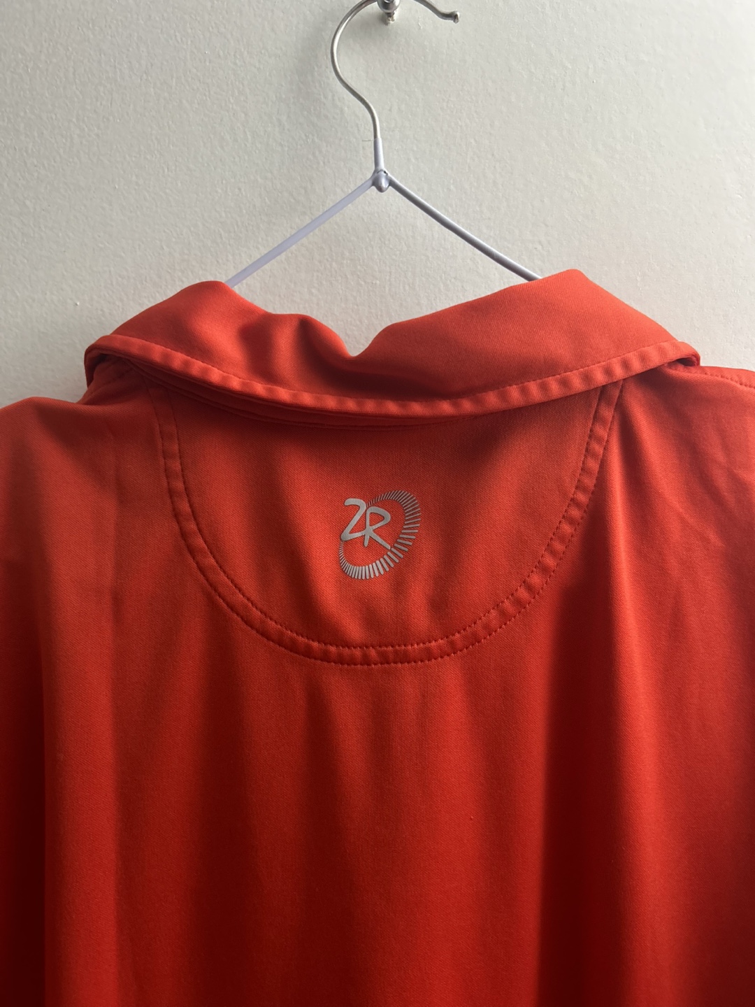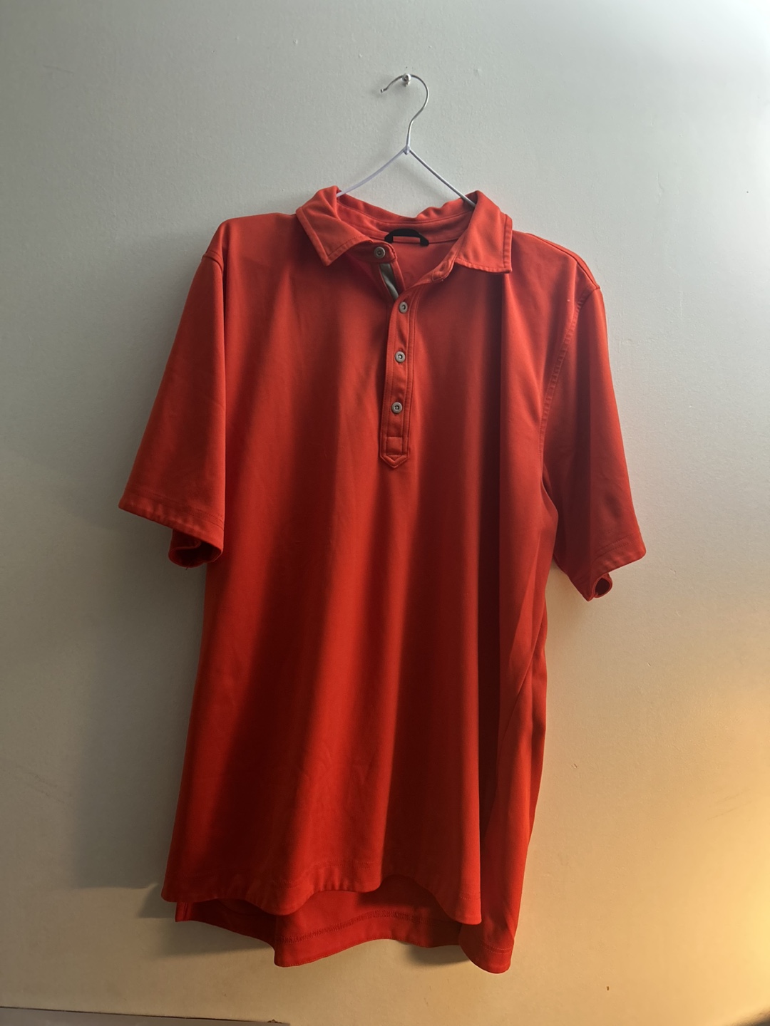 Orange short-sleeved golf polo shirt. Has a button closure and a collared neckline.