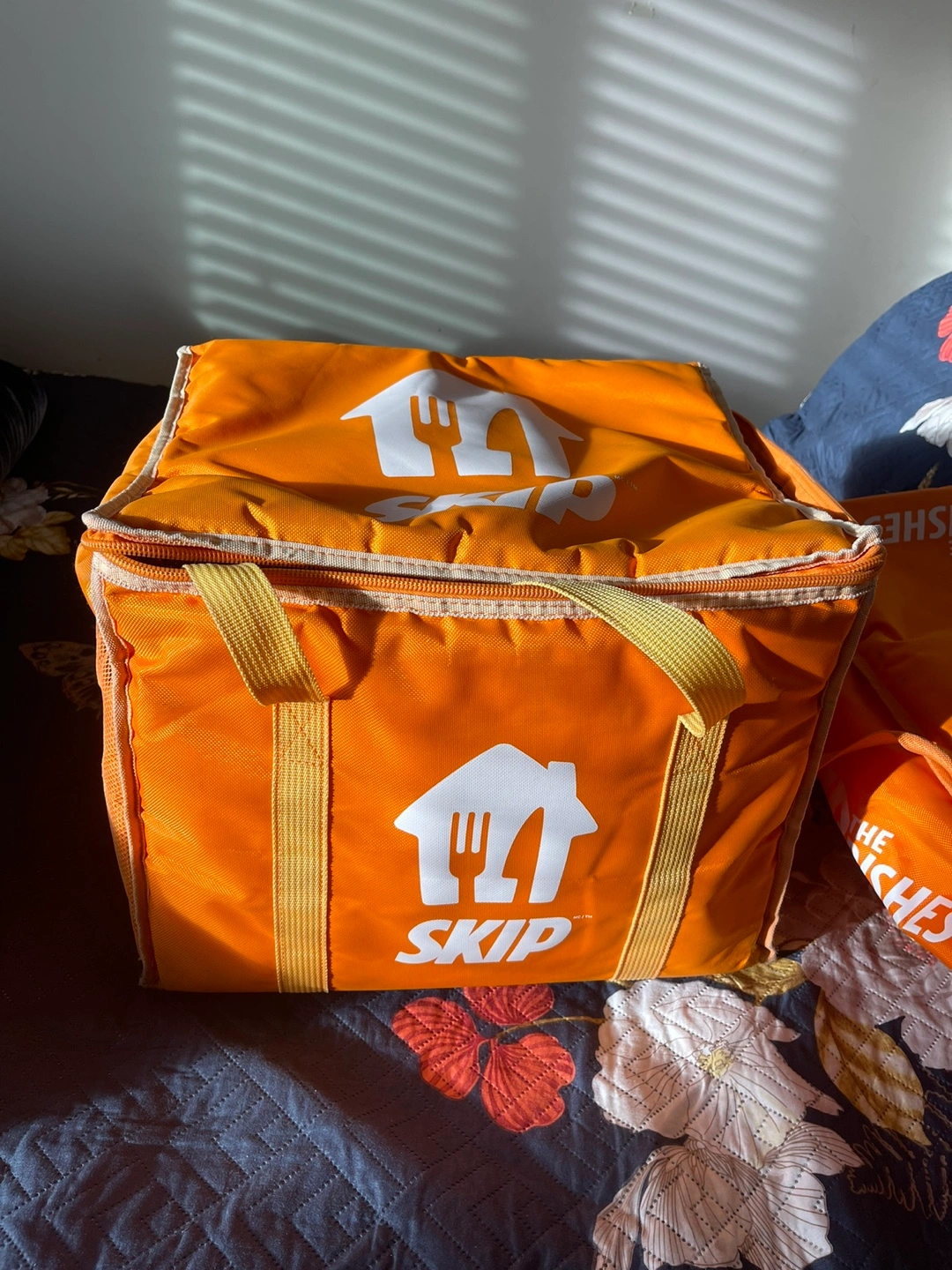 Orange delivery bag with Skip The Dishes logo. Insulated interior. Used but in good condition.