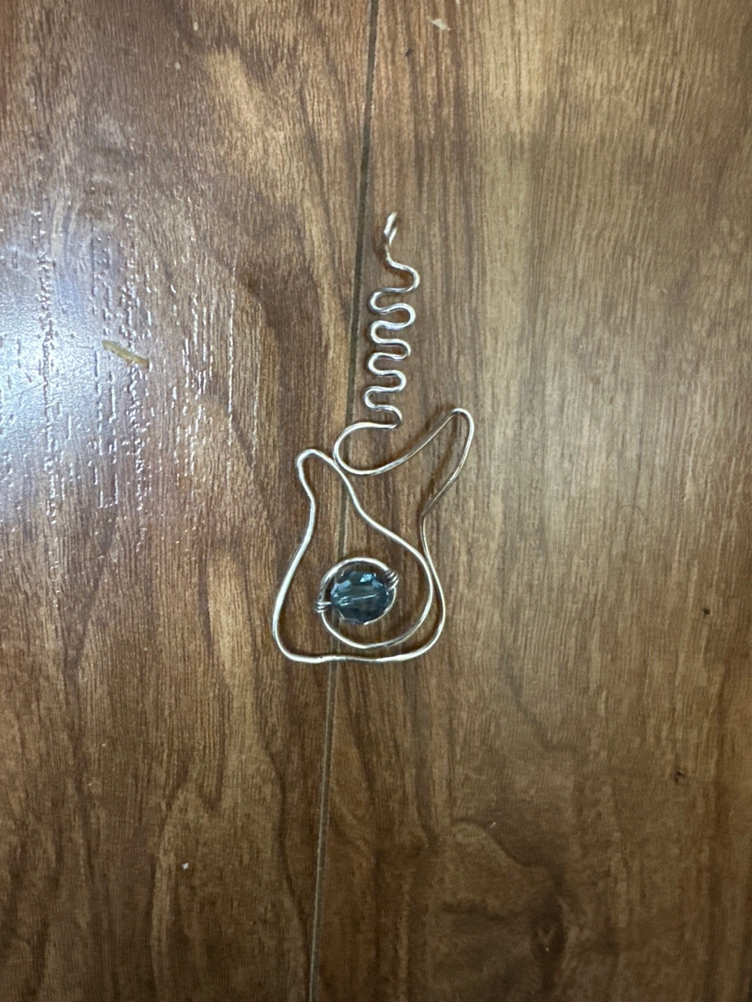 Handmade Silver wire pendant shaped like a guitar. It has a blue crystal in the centre.