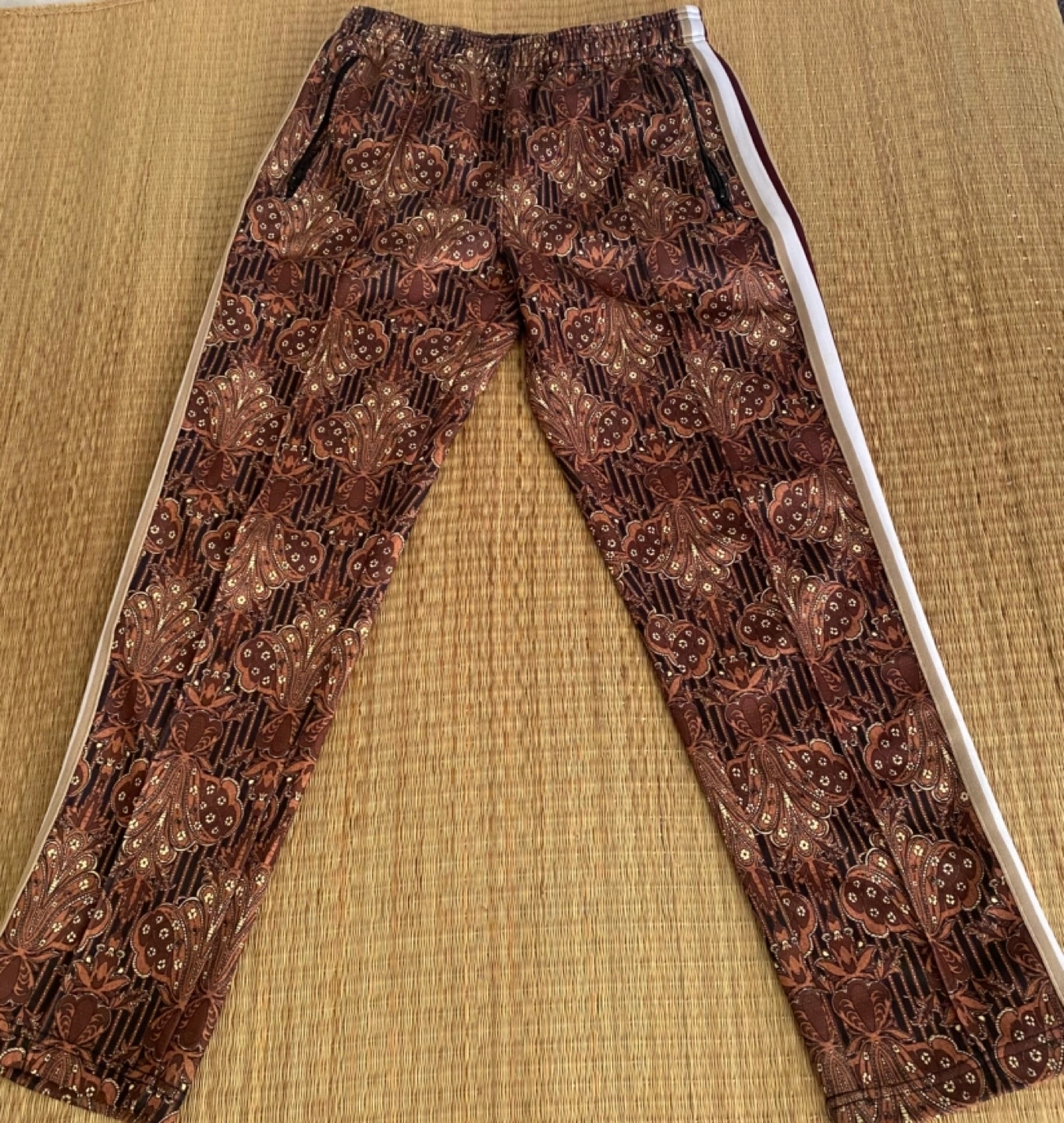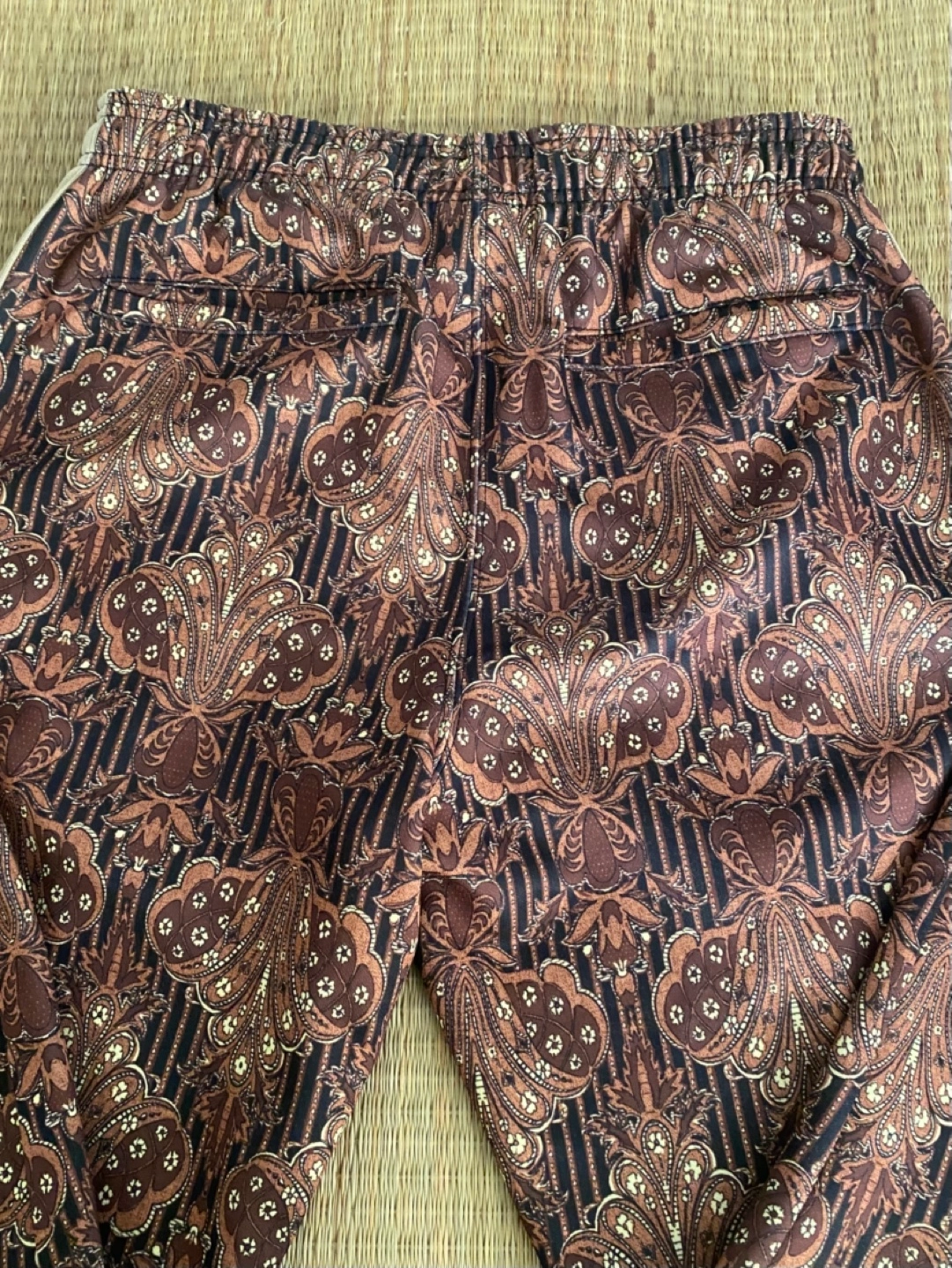 Brown track pants with a floral and paisley pattern and side stripes. Elastic waistband and drawstring. Side pockets. Fits small to medium