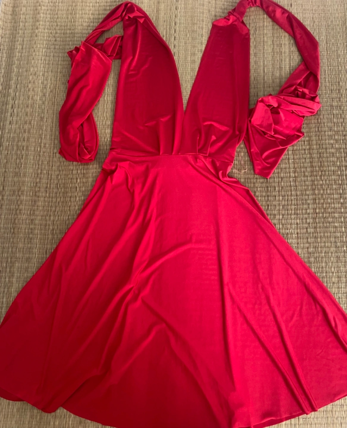 Red halter dress with a deep V-neck and a flowy skirt. It features a tie at the neck and a tie at the back.