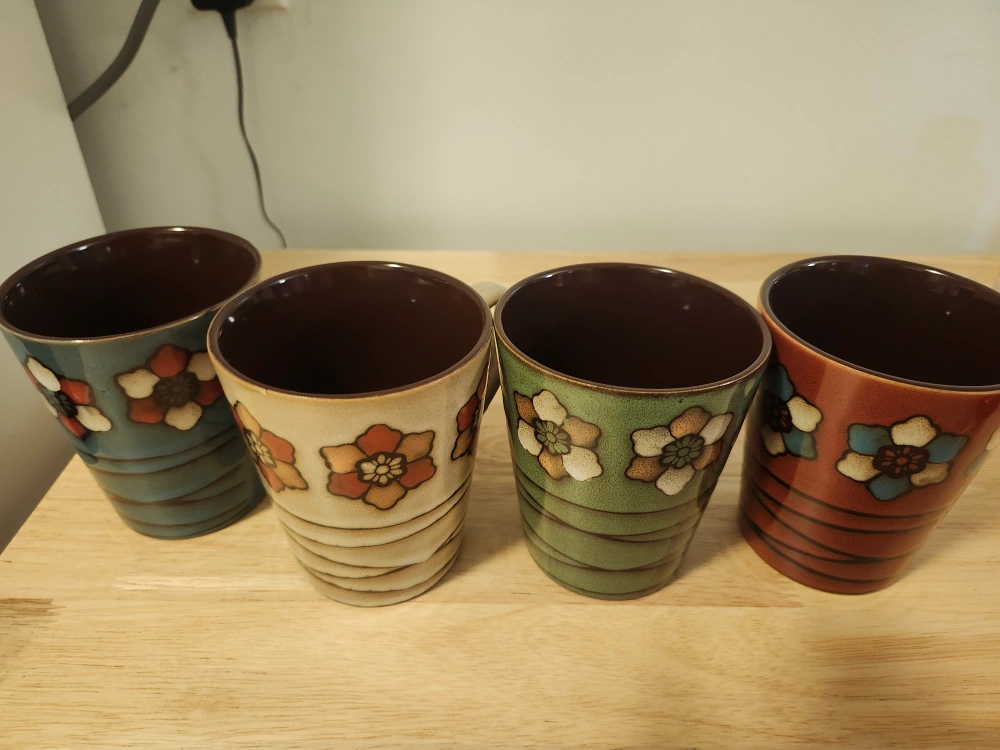 Set of 4 ceramic mugs with floral designs. Each mug is a different colour. No chips or cracks. never used. # freecycle