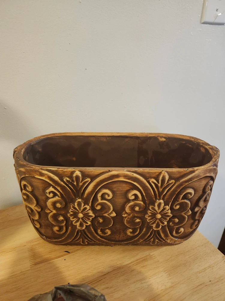 Brown ceramic planter with a floral design. Oval shaped. Never used. # freecycle
